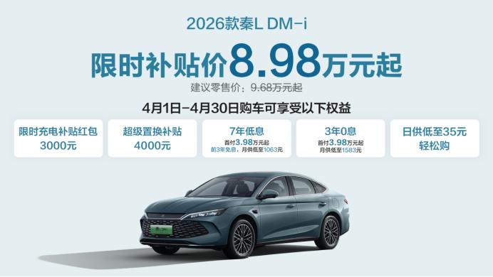 中级插混家轿王炸福利来了!比亚迪 2026 款秦 L DM-i4 月限时权益正式开启,置换 + 充电双重补贴至高 7000 元,补贴后价格仅 8.98 万起,同步推出 3 年 0 息、7 年低息金融方案,首付 3.98 万就能轻松入手。新车 210km 纯电续航满足日常通勤零油耗,2110km 综合续航彻底告别里程焦虑,2.79L 超低油耗超省钱,云辇 - C 底盘、智能冷暖冰箱等配置拉满,家用出行全能适配。