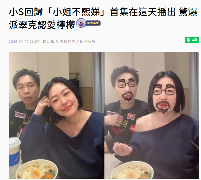 【小s回归小姐不熙娣首集6日播出】小S(徐熙娣)和派翠克(柳柏丞)最近进棚录《小姐不熙娣》,两人在休息空档开直播和网友互动,小S透露,自己回归节目的首集将在4月6日播出。《小姐不熙娣》这档节目是大S鼓励妹妹走出舒适圈做的,“小姐不熙娣”谐音“不吸地”,是代表现代女生可以有自己的想法,不是结婚了只能扫地带孩子。大S因流感并发肺炎去世后,小S向节目请假半年。(联合报)