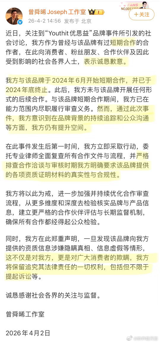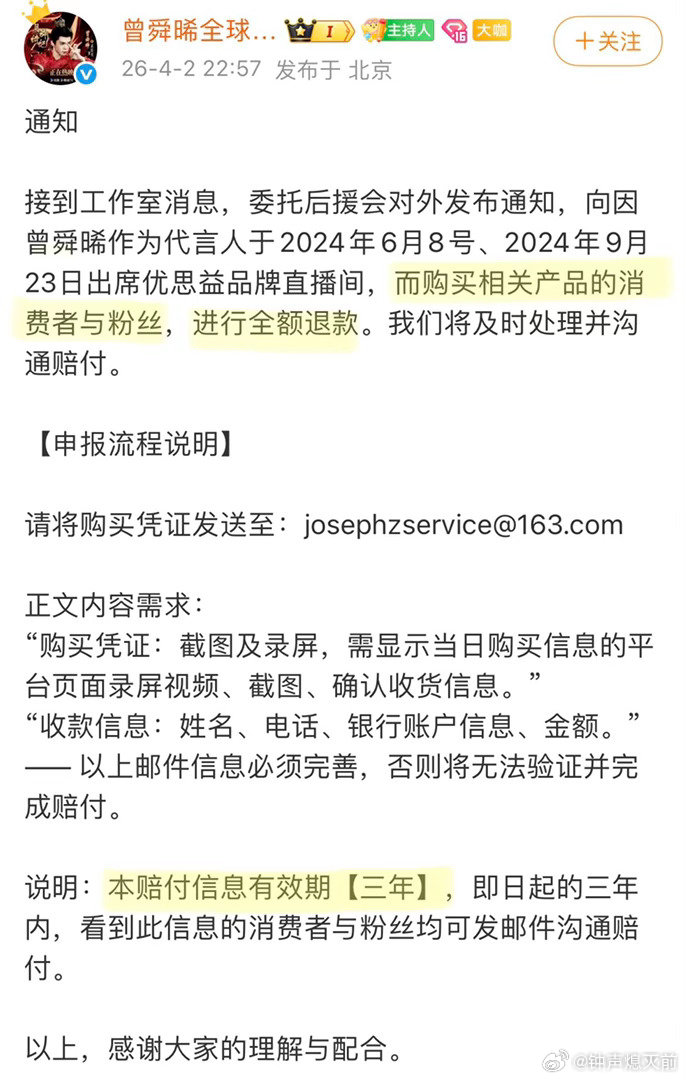 曾舜晞真的很有担当优思益是两年前的短代,依旧道歉➕全额退款,甚至赔付期还是三年,比代言时间还长,很有责任心了