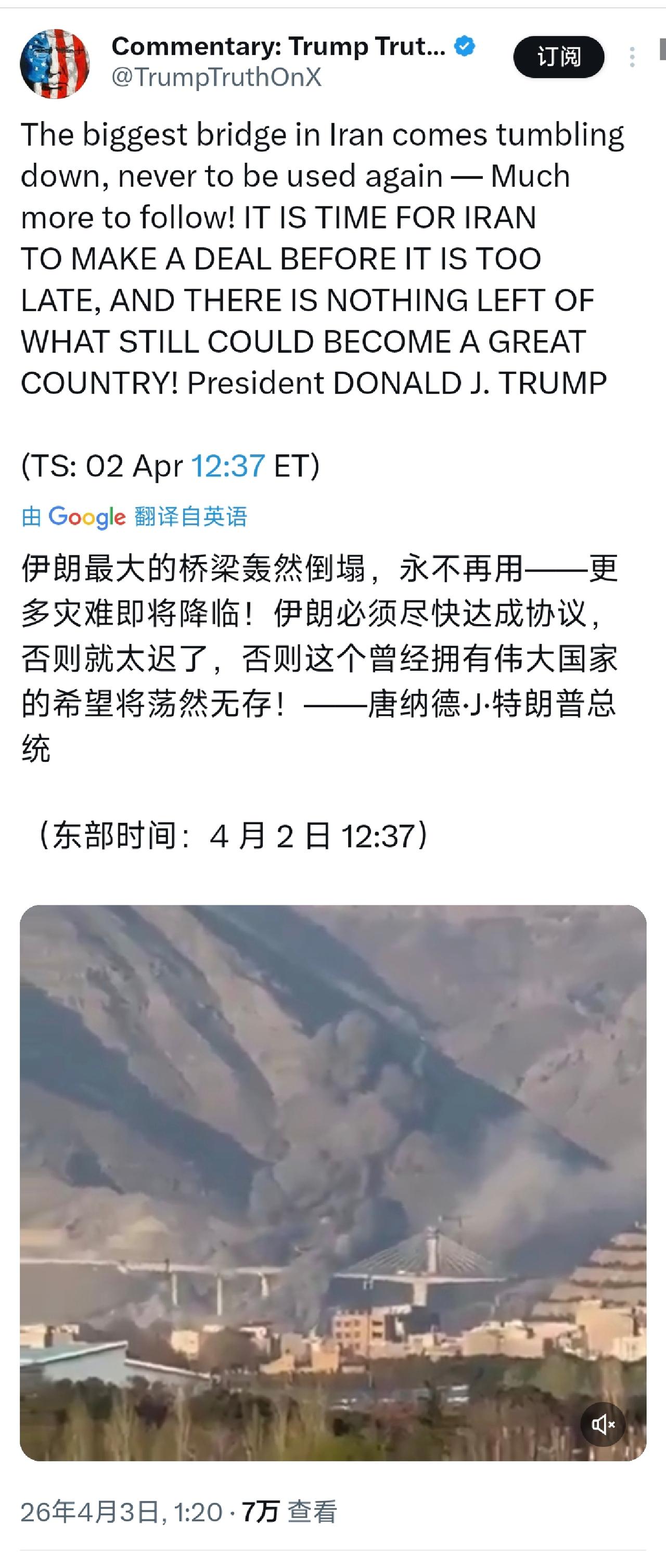 特朗普北京时间4月3日发文写道:“伊朗最大的桥梁轰然倒塌,永不再用——更多灾难即将降临!伊朗必须尽快达成协议,否则就太迟了,否则这个曾经拥有伟大国家的希望将荡然无存!” 特朗普这是在炫耀美国对伊朗民用设施的袭击,还在赤裸裸地威胁伊朗,那副嚣张又虚伪的样子,简直令人作呕。 4月2日,美国和以色列联手对伊朗卡拉季市的贝伊克公路桥发动了空袭,这座桥就是特朗普嘴里说的“伊朗最大的桥梁”,也被称为B1桥,是伊朗的标志性工程,号称中东最高的桥梁,也是德黑兰连接里海的重要交通枢纽,属于纯民用基础设施,全程没有任何军事活动,而且当时还没正式投入使用,是伊朗花了很多心思打造的民生工程,目的就是为了方便民众出行,缓解当地的交通压力。 更让人愤怒的是,当天正好是伊朗波斯新年诺鲁孜节的最后一天,附近村庄的老百姓正在桥附近野餐庆祝,完全没有任何防备,突如其来的空袭瞬间打破了平静。 根据伊朗阿尔博兹省副省长赛义夫的说法,这次空袭造成了8名平民死亡、95人受伤,伤亡人员全是无辜的普通民众,没有一个军人。 更卑劣的是,在急救人员赶到现场救治伤员、清理废墟的时候,美国和以色列又发动了第二次空袭,专门针对救援人员,就是想造成更多的人员伤亡,这种连救援人员都不放过的行为,简直是丧心病狂,毫无人道主义底线。 特朗普不仅不掩饰这种残忍的行径,反而特意把大桥被炸的视频发到了社交平台上,配文炫耀,那副沾沾自喜的模样,仿佛做了什么多么了不起的大事。 他嘴里反复强调的“达成协议”,根本不是什么平等的谈判,而是想逼着伊朗接受美国的极端要求,放弃自己的国家主权,任由美国摆布,说白了就是霸权主义的强盗逻辑。 在此之前,特朗普就曾经威胁过,如果伊朗不配合,不停止对霍尔木兹海峡的“事实上的封锁”,美国就会摧毁伊朗所有的发电厂和其他基础设施,现在他真的说到做到,动手炸了民用大桥,就是想通过这种伤害无辜民众、破坏民生设施的卑劣手段,给伊朗施压,逼伊朗妥协。 最让人不齿的就是特朗普和美国的双重标准。平时美国总是站在道德制高点上,动辄指责其他国家破坏民用设施、伤害平民,标榜自己是“人权卫士”,是“和平使者”,可到了自己身上,却毫无底线,肆意妄为。 就在这之前一个月里,美国和以色列已经对伊朗发动了多次军事打击,不仅空袭了伊朗的高校、重水工厂这些民用设施,还蓄意打击伊朗的科研机构,目的就是想削弱伊朗的科学基础和民生保障,让伊朗民众陷入困境。 要知道,伊朗的洪达卜重水工厂,本身不包含任何已申报的核材料,没有任何军事威胁,却遭到了美以的两轮空袭,导致工厂严重损坏,彻底停止运行;伊朗的伊斯法罕理工大学,更是在几天内两次遭到空袭,美国和以色列企图通过轰炸大学,摧毁伊朗人民对知识的渴求,可他们万万没想到,这种行径反而激发了伊朗人民的反抗意志。 伊朗外长阿拉格齐早就明确回应过,这种袭击民用设施的行为,根本不能迫使伊朗投降,只能表明“处于混乱状态的敌人”的失败和士气崩溃,每一座被毁的桥梁和建筑,伊朗都会重建,而且会更加坚固,而美国的国际地位受损,已经是不可逆转的事实。 其实特朗普心里打得算盘很清楚,美以对伊朗的军事行动已经持续了一个多月,可伊朗的军事力量远比他们预想的要顽强,伊朗的地下军事基地和导弹部队,就连美国的超级钻地炸弹都难以摧毁,美以在军事上讨不到任何便宜,就只能转而袭击民用设施,想用这种卑劣的方式拖垮伊朗的民生,逼伊朗屈服。 除此之外,特朗普现在的处境也很艰难,美国国内的支持率已经跌到了36%,是他重返白宫以来的最低水平,而且美军内部的反战情绪越来越高,“良心拒服兵役者”的人数增加了10倍,很多士兵都不愿意参与这场不义之战,他之所以这么嚣张地炫耀炸桥,一方面是想施压伊朗,另一方面也是想转移国内民众的注意力,挽回自己的支持率。 可特朗普显然打错了算盘,伊朗从来都不是一个会轻易屈服的国家。伊朗武装部队已经明确表示,美国和以色列军事指挥官及政治官员的住所,将成为伊朗的合法打击目标,而且伊朗已经组织了超过100万人为地面战斗做准备,大量年轻人主动报名参战,就是要反抗美国和以色列的霸权侵略。 更重要的是,国际社会也看清了美国的真面目,巴基斯坦、土耳其、埃及、沙特等四国已经组成委员会,全力推动美伊和谈,呼吁各方尊重国家主权和领土完整,通过外交手段解决冲突。 特朗普的这番发文,看似嚣张跋扈,实则暴露了美国的霸权本质和内心的无力。他以为炸一座民用大桥,就能吓住伊朗,就能逼伊朗妥协,可他忘了,压迫越重,反抗就越强,伤害无辜民众、破坏民用设施的恶行,只会遭到全世界的谴责,只会让更多的国家看清美国的双标和虚伪。