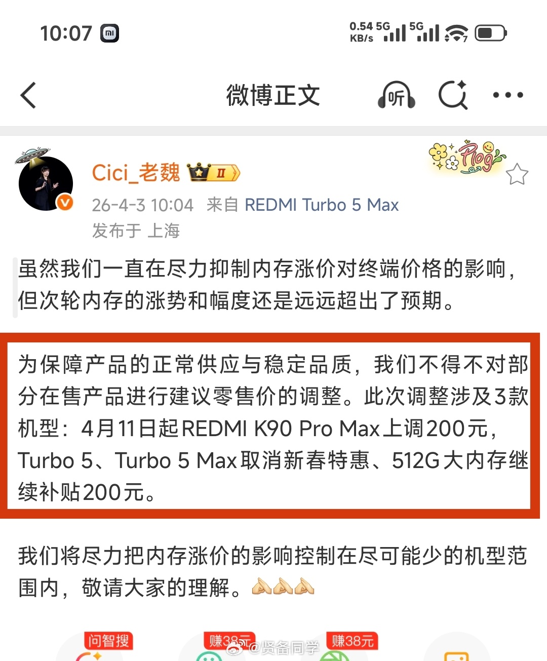 4月11日起REDMI K90 Pro Max上调200元