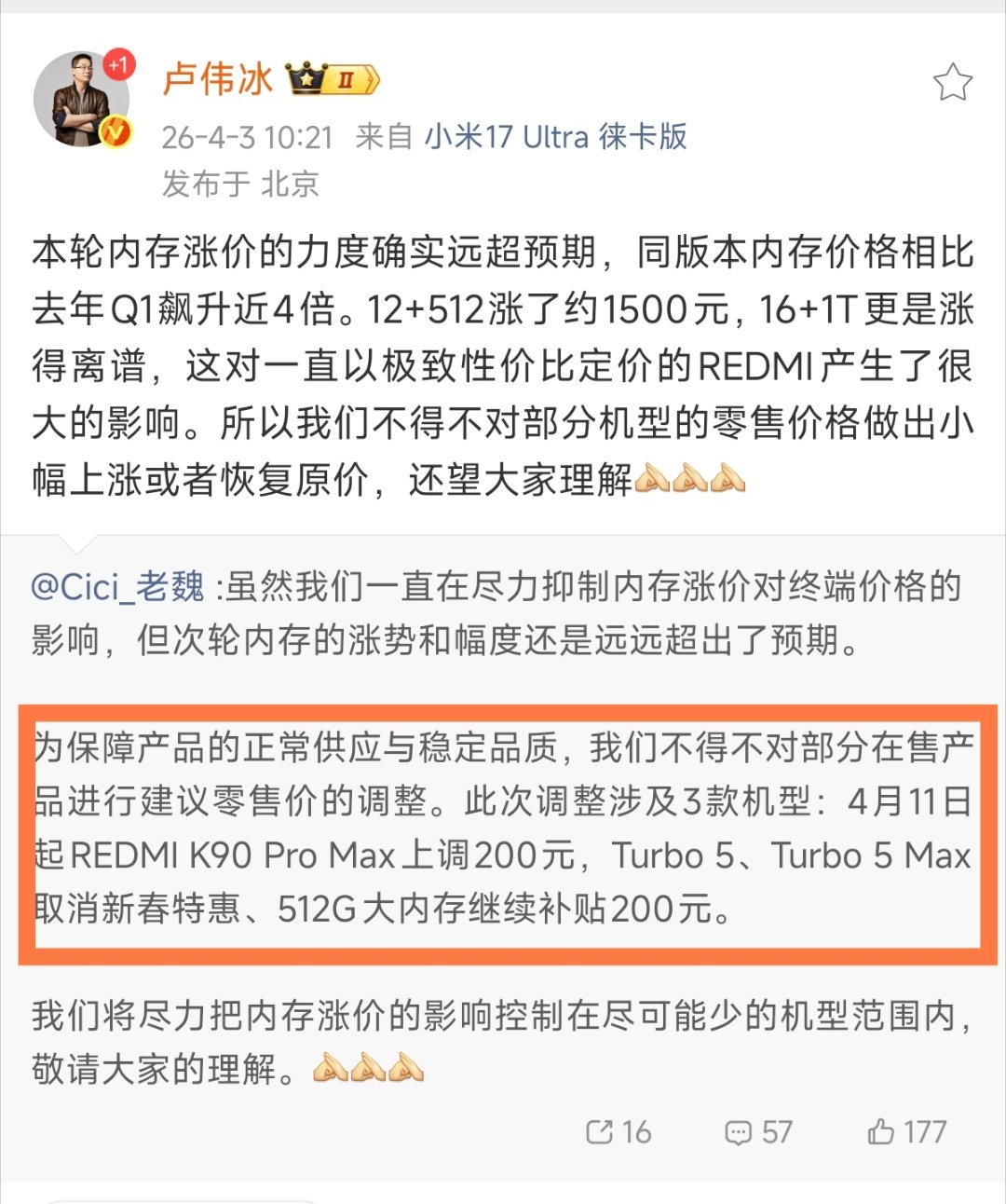 涉及3款机型:1、REDMI K90 Pro Max上调200元,2、Turbo 5、Turbo 5 Max取消新春特惠、512G大内存继续补贴200元。