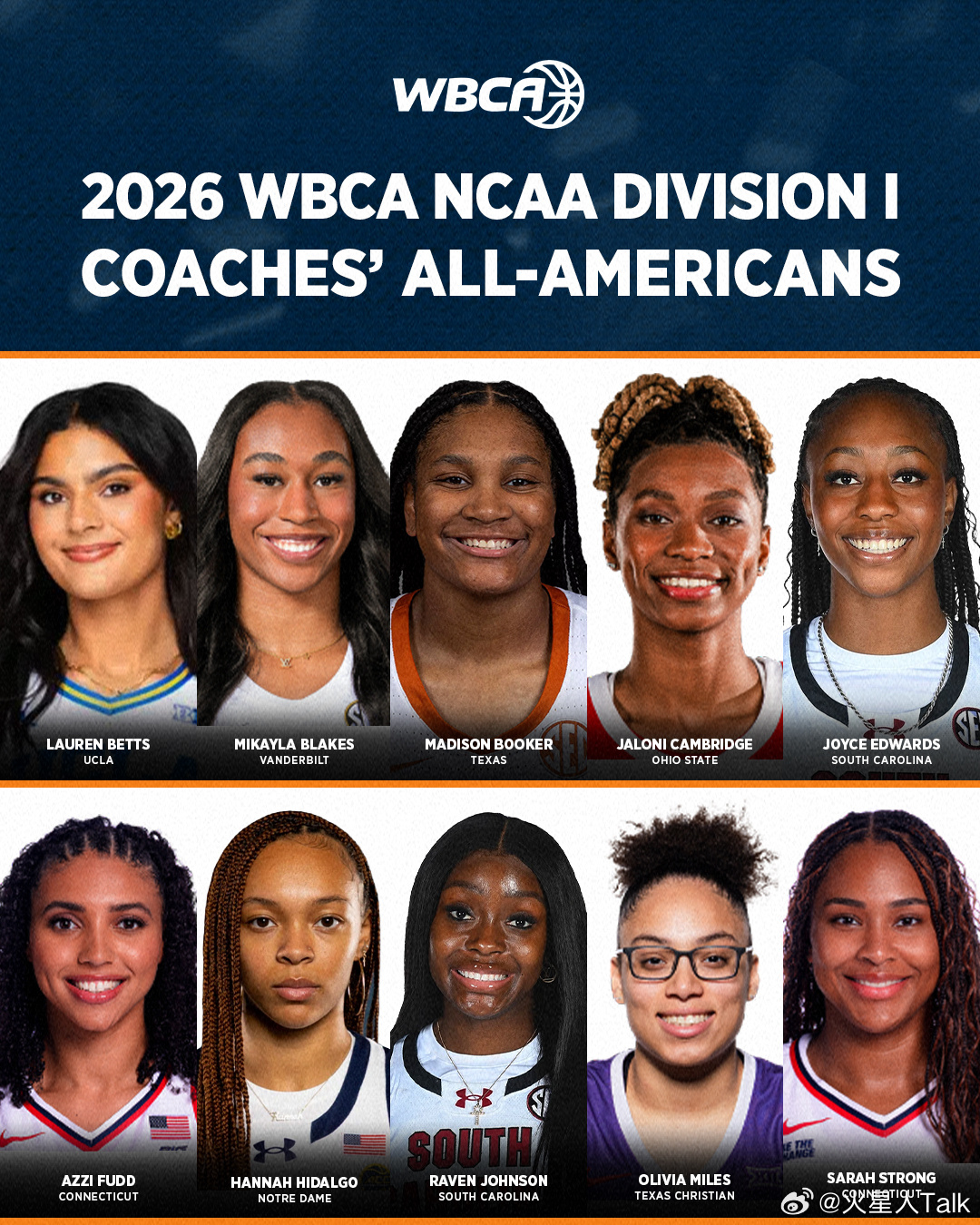 2025-2026赛季NCAA女篮 WBCA(女子篮球教练协会)的个人奖项和最佳阵容。 年度最佳球员:Sarah Strong。年度最佳防守球员:Hannah Hidalgo。年度最佳新人:Jazzy Davidson。年度最佳教练:Shea Ralph。年度最佳新秀教练:Katie Kuester。
