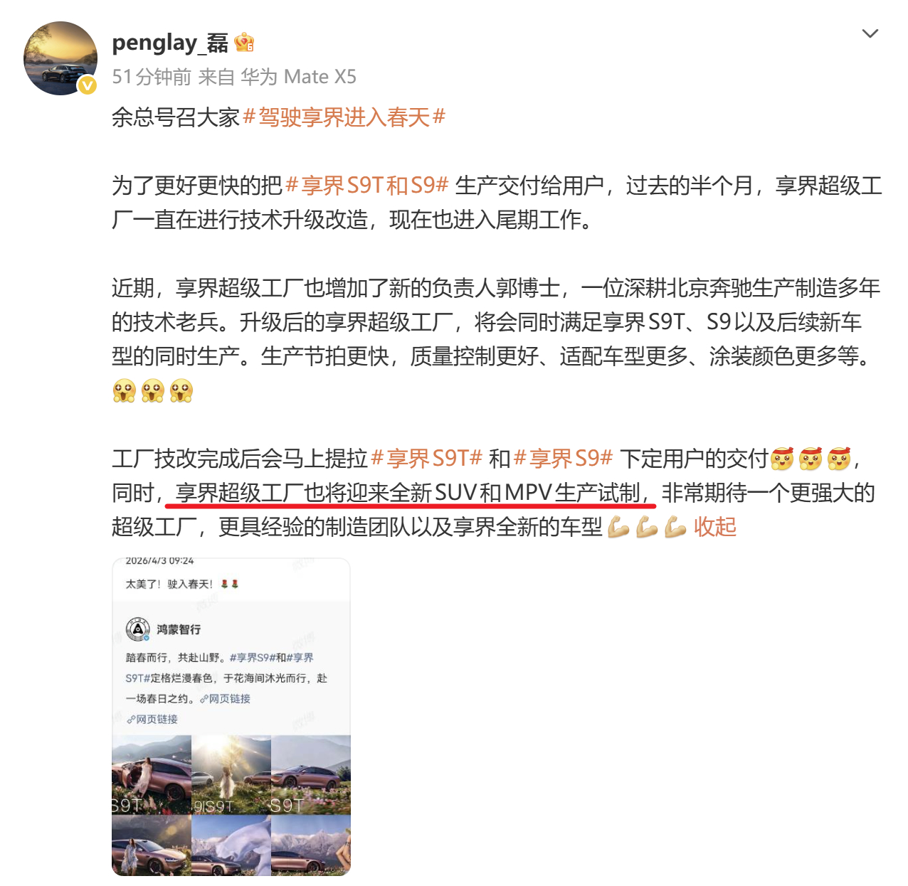 “享界超级工厂也将迎来全新SUV和MPV生产试制”享界都是一些有个性的品类,期待