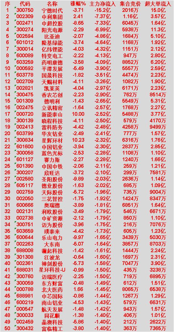 4月3日上午盘,主力趁低位,大幅买入50名单: 中际旭创:上涨 5.84%,主力净流入 15.1 亿元 中油资本:上涨 9.68%,主力净流入 14.0 亿元 亨通光电:上涨 8.58%,主力净流入 11.0 亿元 新易盛:上涨 3.74%,主力净流入 10.8 亿元 通宇通讯:上涨 10.00%,主力净流入 9.73 亿元 4月3日中午收盘,主力资金“大幅卖出”的50名单: 宁德时代:下跌 3.71%,主力净流出 15.2 亿元 中利集团:上涨 2.41%,主力净流出 7.37 亿元 中超控股:下跌 8.65%,主力净流出 7.33 亿元 阳光电源:下跌 2.29%,主力净流出 6.99 亿元 比亚迪:下跌 2.07%,主力净流出 4.86 亿元