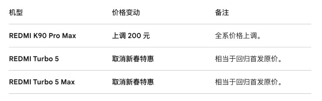 小米调价要买的赶紧冲趁没调价前!REDMI K90 Pro Max上调200元,REDMI Turbo 5系列取消新春特惠!