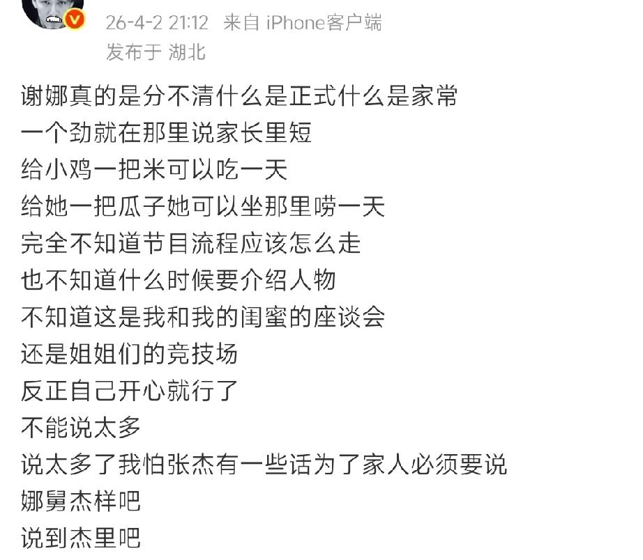 看完昨天的浪姐,你就会理解陈建斌在「甄嬛传」剧组天天头疼的原因了。[呲牙] 30多个姐姐,加上30多个送考人,在一个室内空间里叽叽喳喳的聊天,一大半还是女生,那画面简直不敢想! 聊天的内容也是毫无营养,比如刘芸和孙怡这段, 「你没看妻子的浪漫旅行吗?」 「我看那玩意干啥呀」 难怪孙怡会离婚呢,身上完全没有豪门太太的气质,说话总是小太妹风格,跟她的长相太不搭了。 本来人多,吵闹,又找了个比姐姐还呱躁的谢娜来当主持人,简直了! 虽说开播热度很高,但是口碑已经有点崩的趋势了,