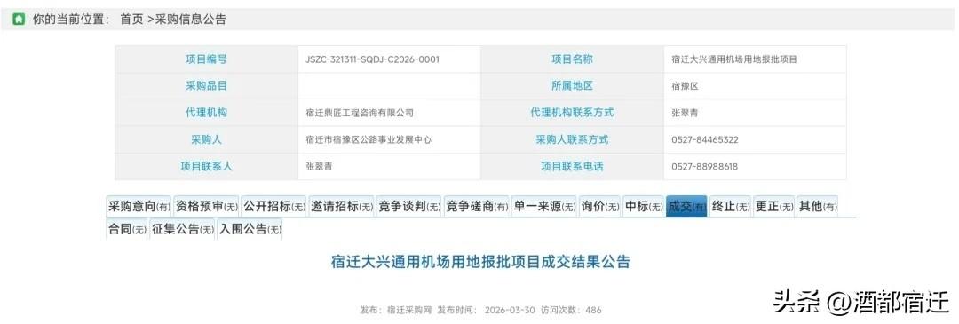 近日,宿迁市政府采购网发布宿迁大兴通用机场用地报批项目成交结果公告,华远规划设计有限公司成功中标。这一关键节点的落地,标志着大兴通用机场前期工作进入全面提速阶段,土地报批、要素保障等核心环节正式启动,为项目年内开工建设筑牢坚实基础。 作为市级重点公益通用机场,该项目的推进将填补宿迁区域通航服务空白,完善综合交通体系,助力应急救援、低空旅游、农林作业与公务飞行等多元发展。随着前期工作稳步落地,宿迁通航时代渐行渐近,城市交通能级与综合承载力将迎来新一轮提升。