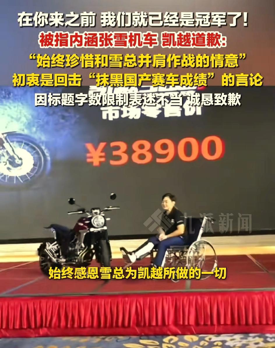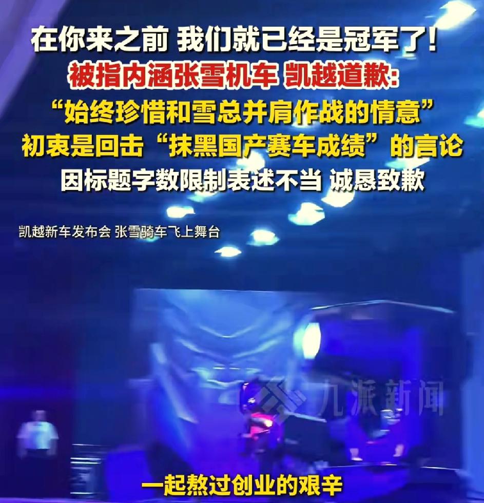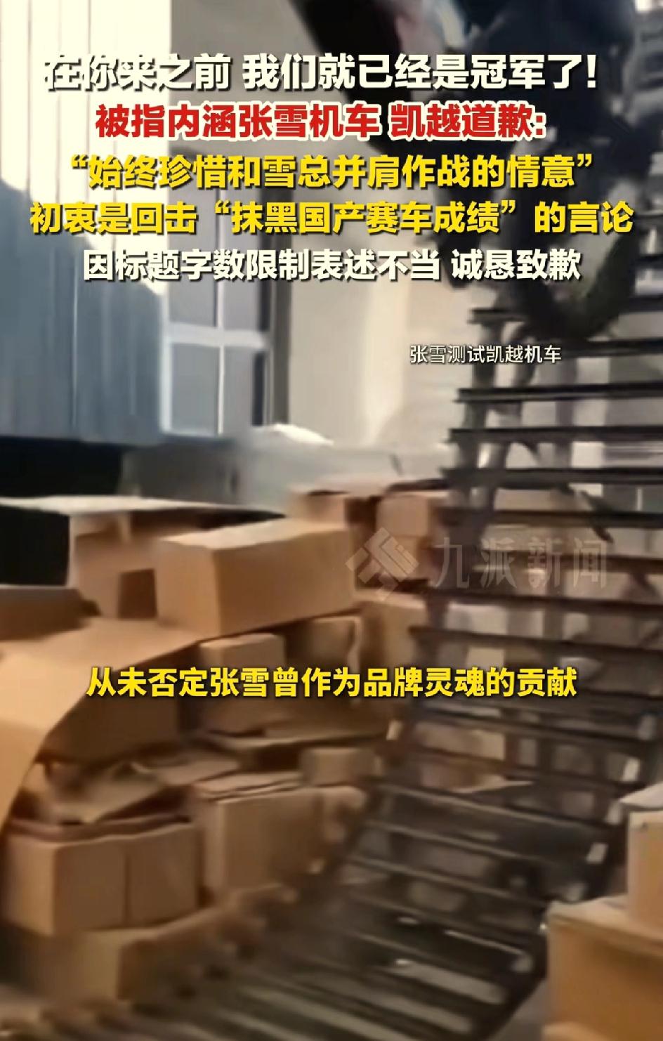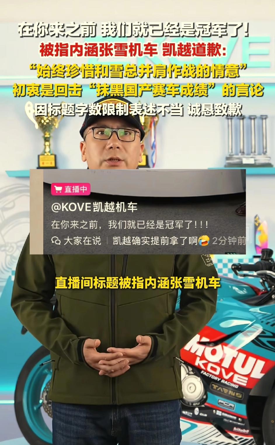 凯越机车正式向张雪道歉。“在你来之前,我们已经是冠军了”凯越机车在直播间里讲的话。被指内涵张雪机车。 被网友质疑后,凯越老总说:始始终珍惜和雪总并肩作战的情谊,大家不要搞恶意对立。雪总为凯越机车所做的一切,我们感恩。