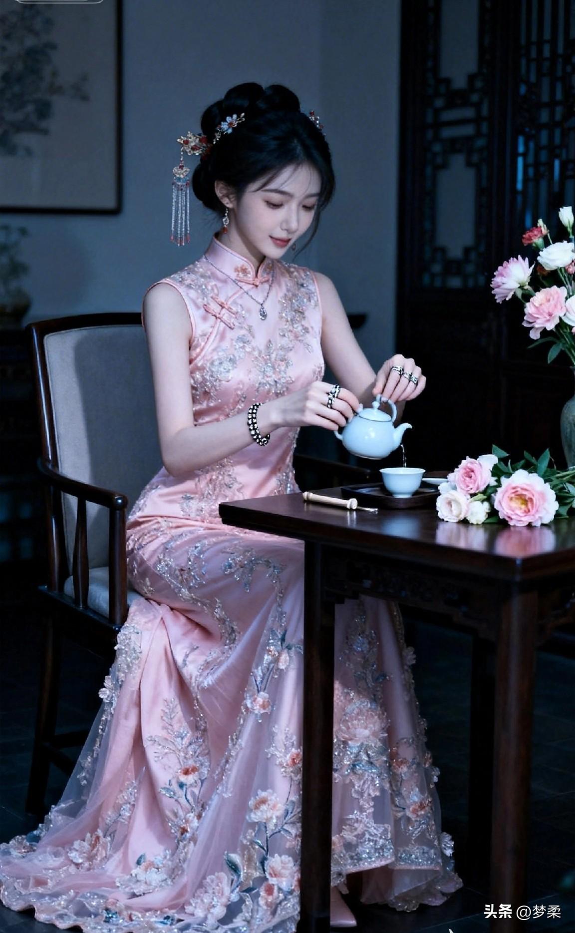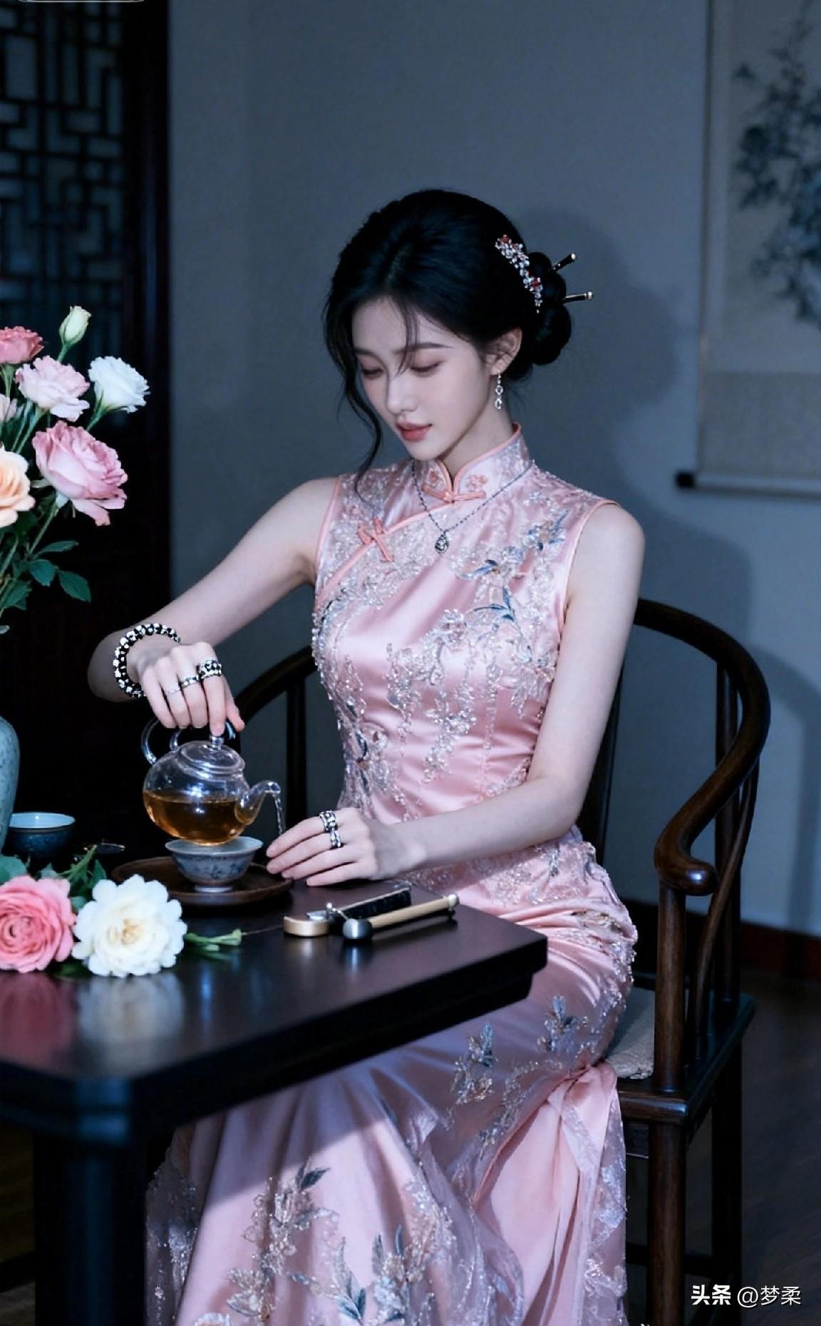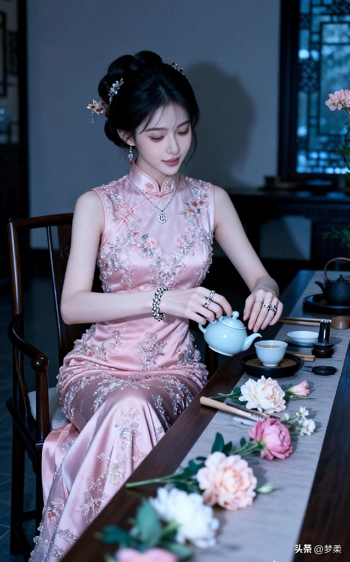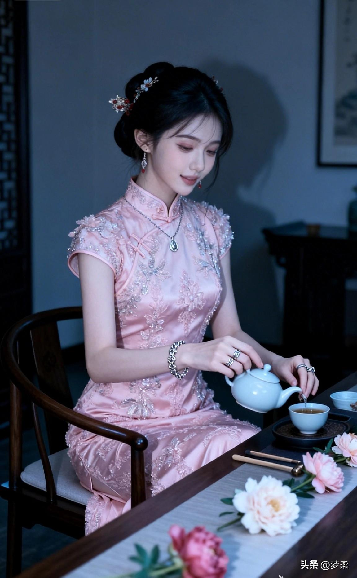 优雅古风茶艺体验,粉色旗袍与茶香相伴
