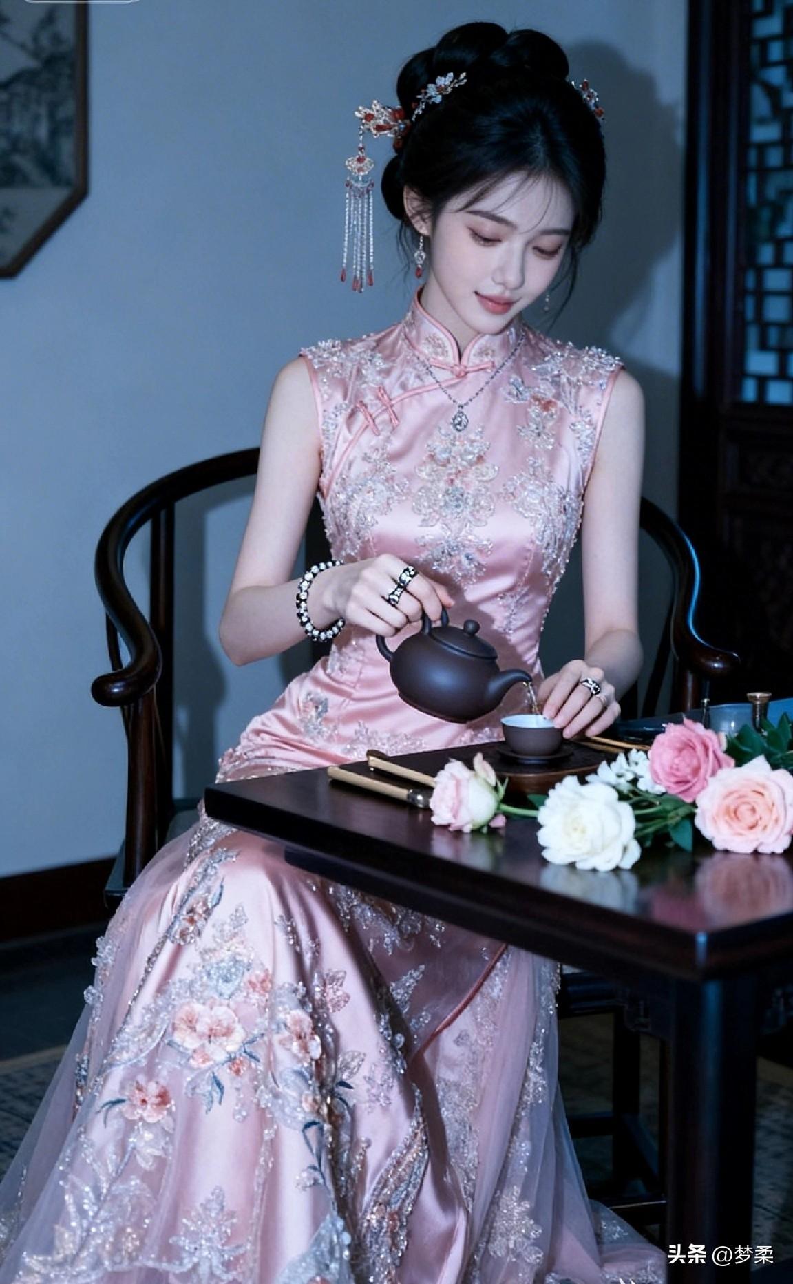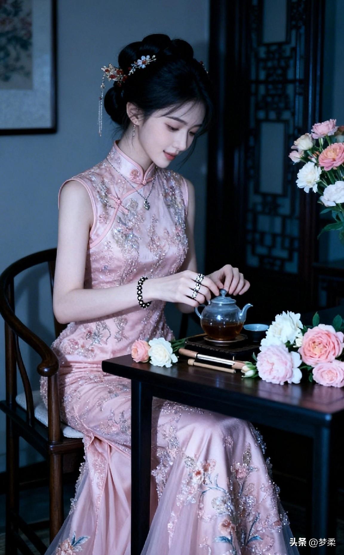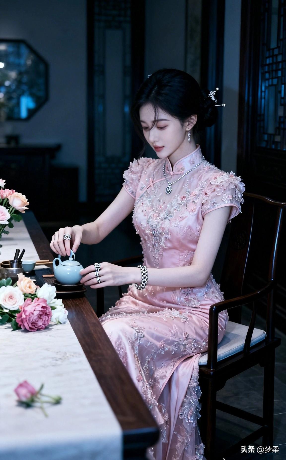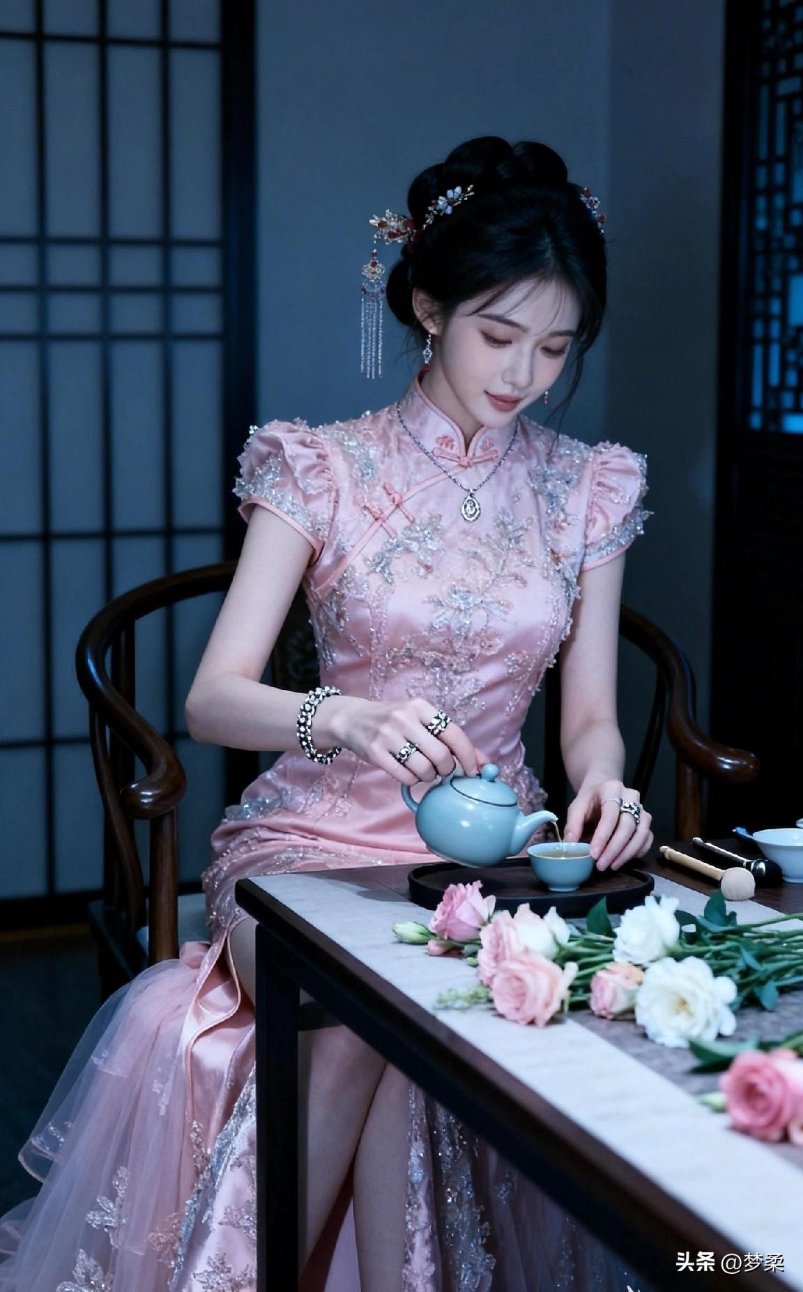 优雅古风茶艺体验,粉色旗袍与茶香相伴