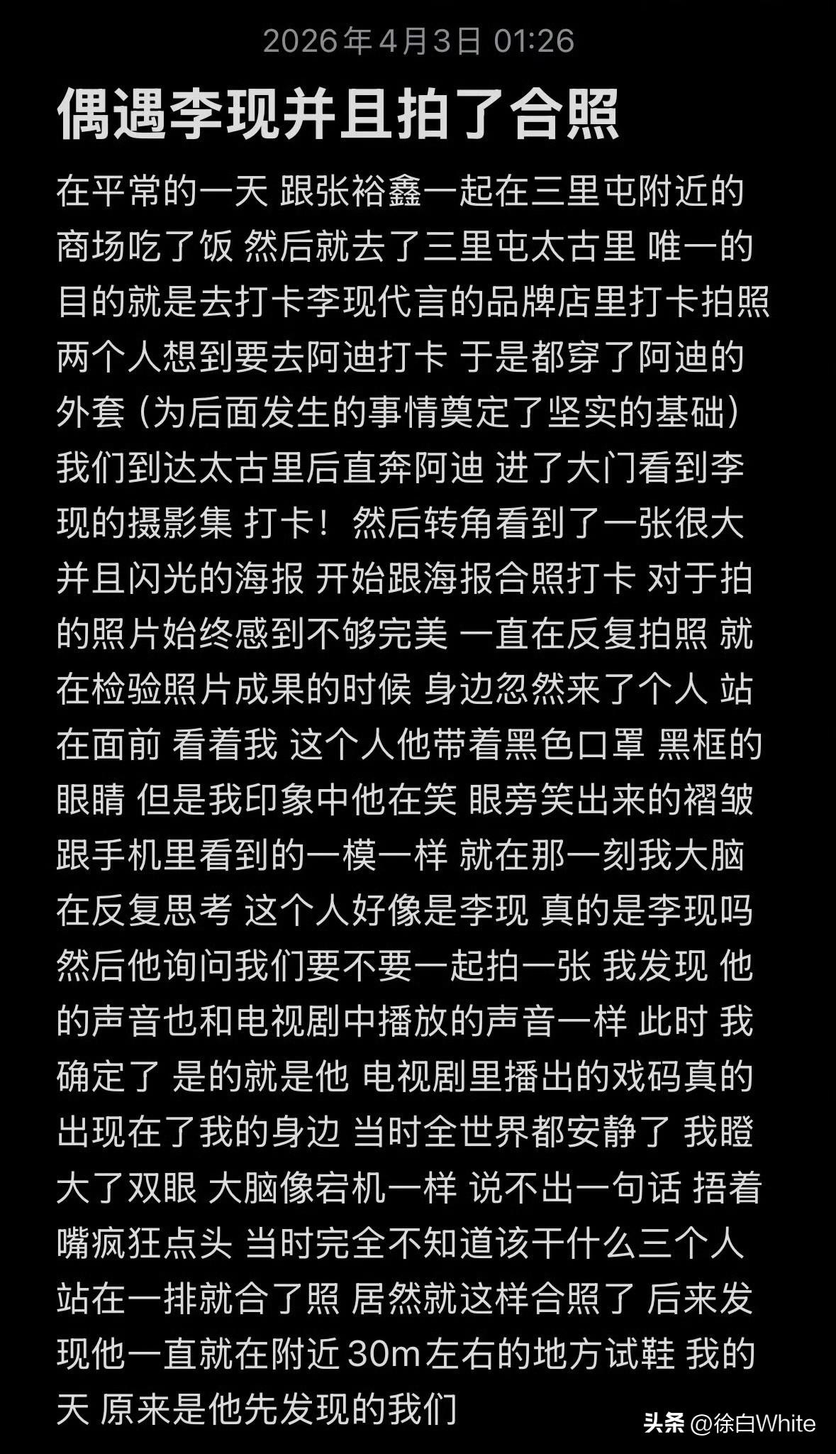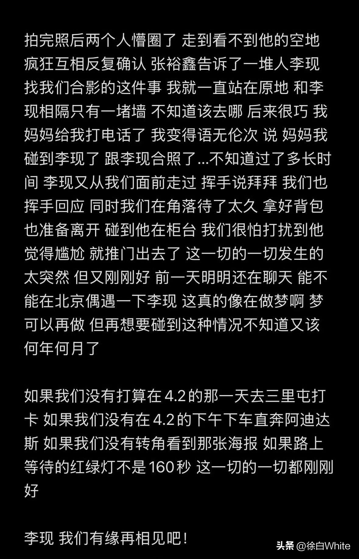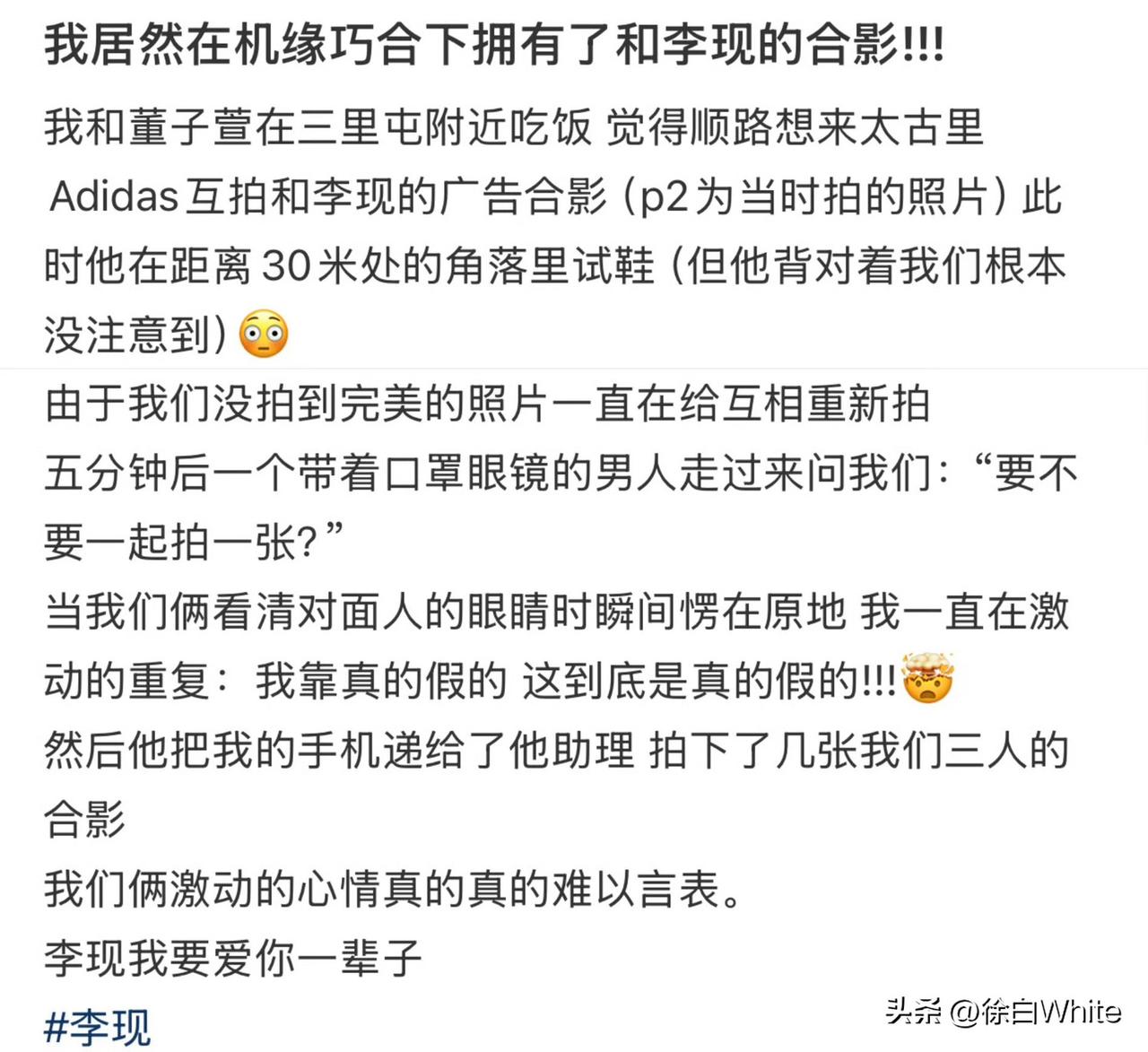 4月3日,网友机缘巧合下与李现本人合影 网友分享在线下跟李现广告牌合影时,李现突然出现,主动打招呼问要不要一起拍一张,网友顿时一脸懵,跟李现对视后,一眼确定了彼此的身份,愣在原地,李现把网友手机给了助理,让助理给他们三拍了几张合照! 网友表示喜悦之情难以言表,不得不说太巧了,李现很讨厌代拍,但真的对真粉很好! 网友小小的分享引来了许多人的羡慕,随后又详细的分享了一下自己的感受,好真实,真的好有缘!