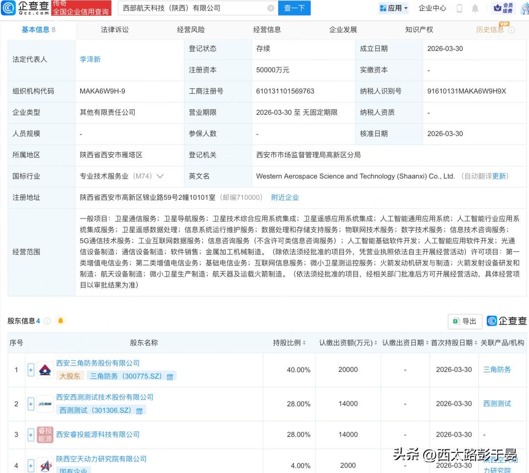西安又添一家航天大公司!就在高新区 3月30日,一家新的航天企业——西部航天科技(陕西)有限公司,在西安高新区正式注册成立。 这家公司来头不小,注册资本5亿元,由陕西几家实力很强的企业和科研机构共同组建,专门做商业航天,简单说就是造火箭、造卫星、搞太空相关业务。 西安本来就是全国有名的航天重镇,很多航天大项目、大单位都在这儿。这次新公司落地,就是要把本地的技术、制造、人才优势整合起来,形成一条完整的航天产业链,从研发、生产到应用,全都能在西安完成。 从航天基地到高新区,西安航天产业版图持续扩容。这家本土“航天新巨头”,未来必将带动产业链上下游发展,让西安在全国商业航天赛道上更具竞争力! 西安 陕西 商业航天 西安高新区