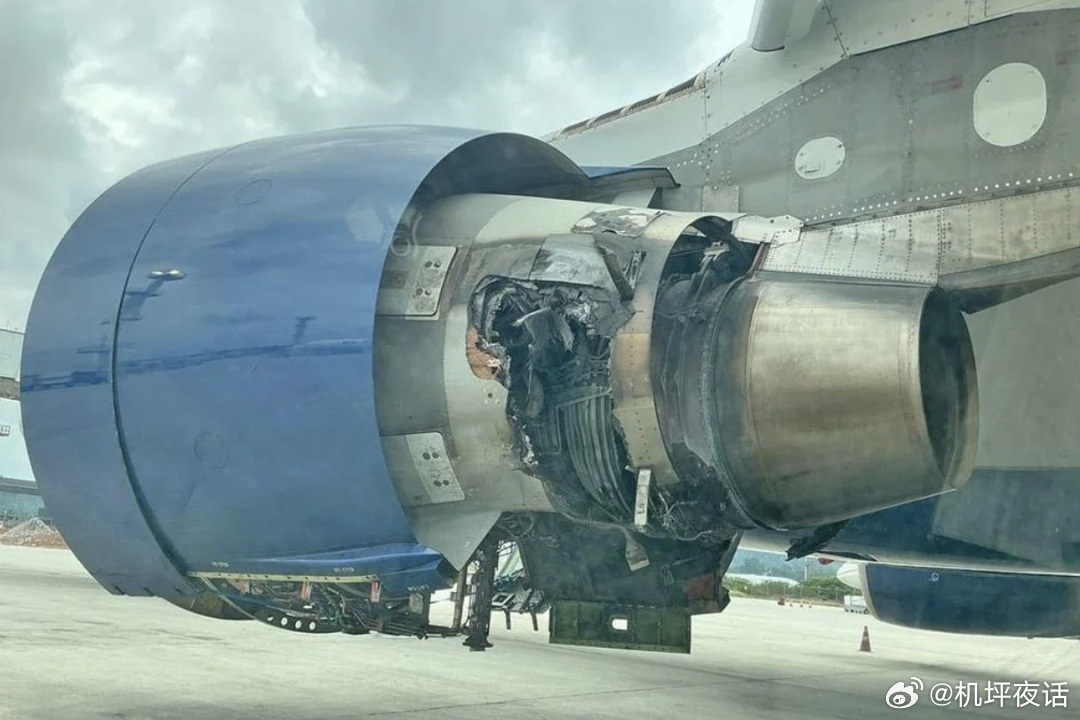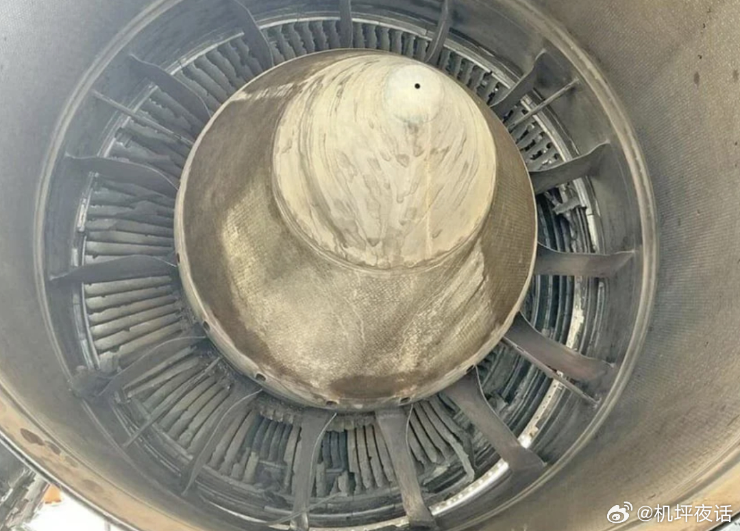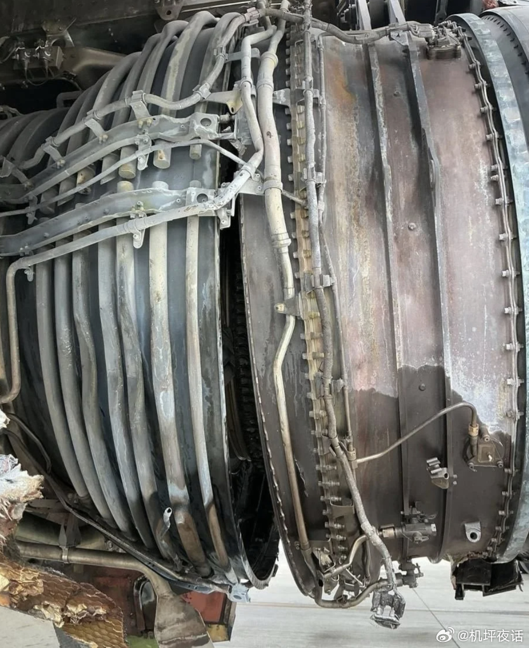从照片看,发动机受损严重:反推包皮破损,燃烧室和高压涡轮单元连接结构断裂,涡轮出口叶片也有大面积断裂。