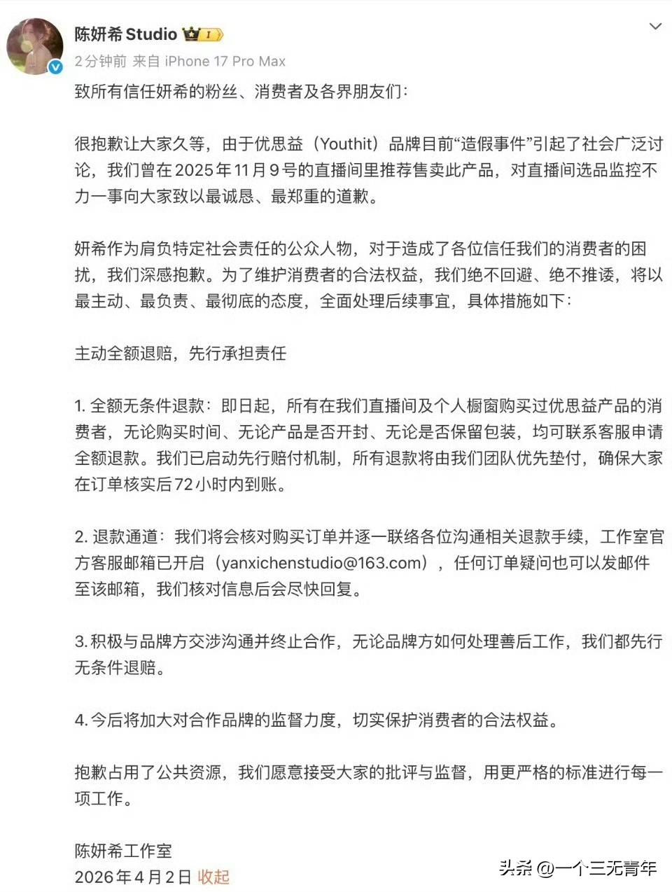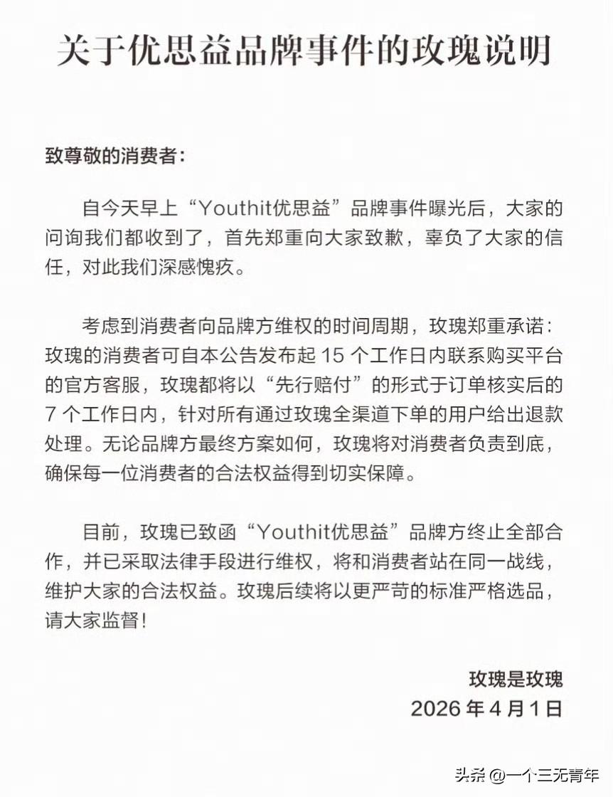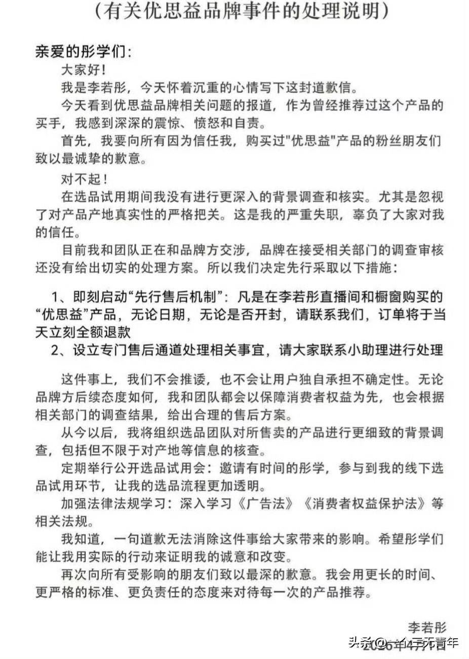 优思益品牌全链条造假事件的曝光,以一场荒诞的闹剧,再次击碎了市场中长期存在的“洋牌滤镜”。 这不仅仅是一起商业欺诈个案,更是审视消费心理、检验监管效能、推动社会共治的一面镜子,为筑牢消费安全防线提供了深刻的警示。 涉事品牌宣称“澳洲进口”,实则为国内代工生产;其所标榜的海外总部地址竟是汽修厂,且在没有“蓝帽子”认证的情况下大肆宣传保健功效。 通过保税仓进行“洗白”身份、借助明星背书高价收割消费者,这套“国产代工卖高价”的操作模式,不仅侵害了消费者权益,更严重侵蚀了市场诚信的基石。 事件发生后,多部门迅速介入,平台下架、立案调查等一系列举措,展现了整治市场乱象的坚决态度。 “洋牌滤镜”的根源,在于部分消费者对“进口=优质”公式的盲目迷信。 一些商家正是精准利用这种心理,通过虚构海外背景、包装高端人设,将低成本产品卖出高价。优思益事件并非孤立,它暴露了一条成熟的造假产业链,同时也折射出跨境电商监管与平台审核环节存在的漏洞。 破除滤镜,首要在于引导消费者树立科学理性的消费观,学会自主核查商品产地、资质与功效,不再被虚幻的“洋身份”所绑架。 据受购者说:怀孕6个月喝了26盒优思益铁,中途抽血铁元素只剩7了,医生让多补铁,我以为喝得不够从一袋变两袋,结果,我都贫血了,你告诉我这是个假货,找谁说理去。 “澳洲优思益”是某音、某猫销量第一的叶黄素知名品牌,原产地标称为澳大利亚。 其实有点奇怪,想这么多著名网红博主测评这样体量的公司,他们没人去过澳洲么? 但凡去澳洲的药店、商店转转看看,了解一下情况也不至于这样吧,好多大的代销平台、博主,他们如果去澳洲旅行的时候顺便看看,也不至于让这种假洋货骗吧。 看带货其他国外品牌保健品的博主,一般还会去当地的药店或者商店超市拍一拍商品在当地销售的样子,至少证明当地人认可呀,这优思益铺天盖地的卖,都没人发现? 对于上述情况,4月1日,多名曾带货“优思益”的明星博主发布道歉声明。 与辉同行终于道歉了。 在澳洲优思益造假事件发酵,其他带货网红和明星都纷纷道歉退款后,一直观望的与辉同行也扛不住了。 董宇辉的“与辉同行”直播间曾为该品牌带货,销售额达1000w至2500万w。 与辉同行这次的优思益事件,绝不是一句简单的“工作失误”就能搪塞过去的,这本质上就是欺诈,是对所有信任他们的消费者的辜负! 一直以来,与辉同行都标榜每一款产品都会亲自去工厂溯源考察,严把选品关,可优思益所谓的澳洲工厂地址都是假的,实地查证根本就是汽修厂,试问这样的前提下,所谓的工厂考察到底去了哪里? 选品审核的流程又形同虚设到了什么地步? 这根本不是无心之失,而是从源头核查就彻底缺位,是彻头彻尾的不负责任。 李若彤通过“彤享会”发布致歉声明称,品牌在接受相关部门的调查审核,还没有给出切实的处理方案。 即刻启动“先行售后机制”,凡是在李若彤直播间和橱窗购买的“优思益”产品,无论日期,无论是否开封,可联系小助理,订单将于当天立刻全额退款。 李若彤说全额退款,能挽回信任吗? 态度是真不错,算是这帮人里最有担当的了,但想彻底挽回信任,没戏。 她退款是真大方:不管买多久、开没开封、有没有凭证,都能退,公众号申请当天就能到账,还自己先垫钱,不甩锅品牌方。 网友也都说她够诚意,该退的也都退到了。 但问题是,这都是事后补救。 之前带货没把关、给假货站台这事已经板上钉钉了。 现在大家本来就不信明星带货,这一刀扎得太深,就算退了钱,心里那道坎也过不去,一个人再怎么做,也救不回整个行业的口碑。