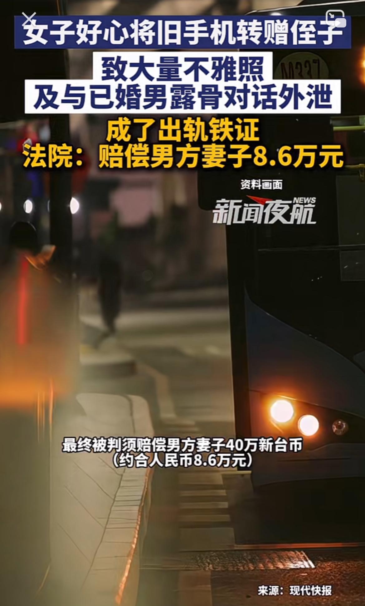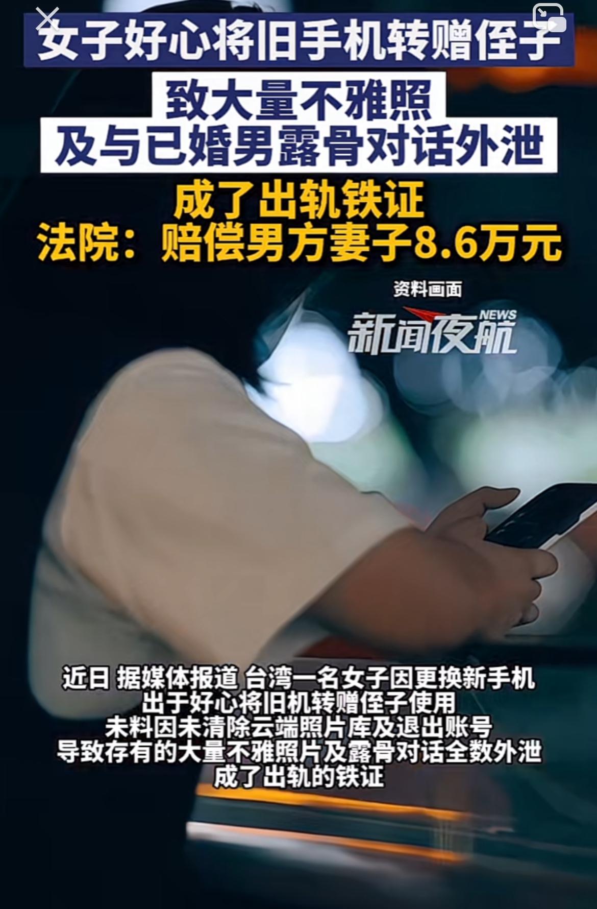 台湾一女子转赠旧手机给侄子,结果爆出大问题。原来手机里有她和已婚男子的不雅照,这些照片外泄后引发轩然大波。最终女子被判赔偿男方妻子40万新台币,换算一下大概8.6万元。 这事儿真给人提了个醒,处理旧手机可得谨慎。现在手机里存着太多个人隐私,随手送人或者卖掉,都可能让隐私暴露。这女子估计肠子都悔青了,一个不经意的举动,不仅伤害了别人家庭,还让自己赔了一大笔钱,真是得不偿失啊。