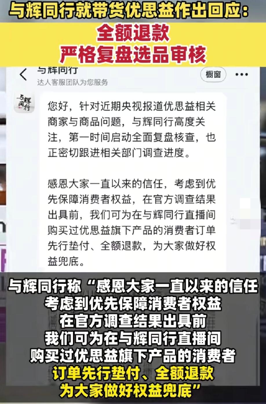 与辉同行积攒多年的好口碑 因带货澳洲优思益彻底塌房了 尽管与辉同行给消费者给出最诚恳的弥补措施,为顾客订单先行垫付全额退款,做好兜底来保障消费者权益,但这似乎也难平大家心中的不满。 优思益能在与辉同行的直播间销售达到千万,说明消费者是奔着信任去的,因为懂与辉曾在直播时坦言选品流程,产品上播前10-20天会做检测,曾经的严选机制也遭到质疑。 不是消费者不买账,而是这种保健品是直接入口的东西,关乎到大家的健康问题,都不能得到严格的把关就上市场进直播间,那么以后消费者还敢买吗?