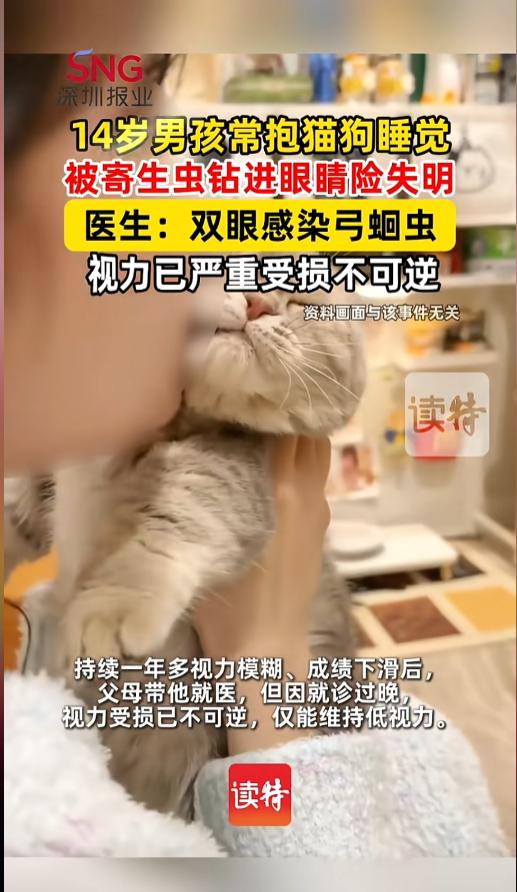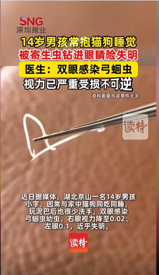 “悲剧还是发生了!”近日,湖北京山,一位14岁的男孩经常和猫狗一起同吃同睡,平时也不注意宠物卫生,结果变得视力模糊,成绩下滑。家长这才带他去了医院,竟然检测出感染了弓蛔虫,差点就失明了!医生:来的太晚了! 自己养的宠物就跟孩子一样,忍不住就想贴贴,尤其是小孩子,本身又好动,又喜欢,不少睡觉都搂着宠物。但是,这种情况风险很高,一得给宠物做好彻底的驱虫,做好宠物卫生。 据媒体4月2日报道,小男孩非常喜欢宠物,平时就经常跟家里的猫猫狗狗一起玩,吃饭睡觉都在一起。但是平时不太注意卫生,抱完之后不洗手就摸眼睛,宠物的驱虫也没有跟上。 久而久之,男孩的视力出现了模糊。可是家长和孩子都没有在意,就这么持续了一年。直到最近,孩子的成绩大幅下滑,视力也愈发的模糊了,家长才带着他去了医院。 医生检查发现,男孩的双眼都感染了弓蛔虫,视力受到大幅损伤。可惜送医实在太晚,损伤已经不可逆了。孩子现在左眼视力0.1,右眼视力0.02,已经接近失明了。 网友看后表示,这家长怎么当的,太不负责任了。孩子和猫狗玩的太近,一不制止,二不做好防护,出现问题也不在意,直到拖到现在,出了大问题才后悔!希望大家都能引以为戒吧! 信息来源:《14岁男孩与猫狗同吃同睡,双眼感染弓蛔虫险失明,医生:不可逆 》深圳新闻网