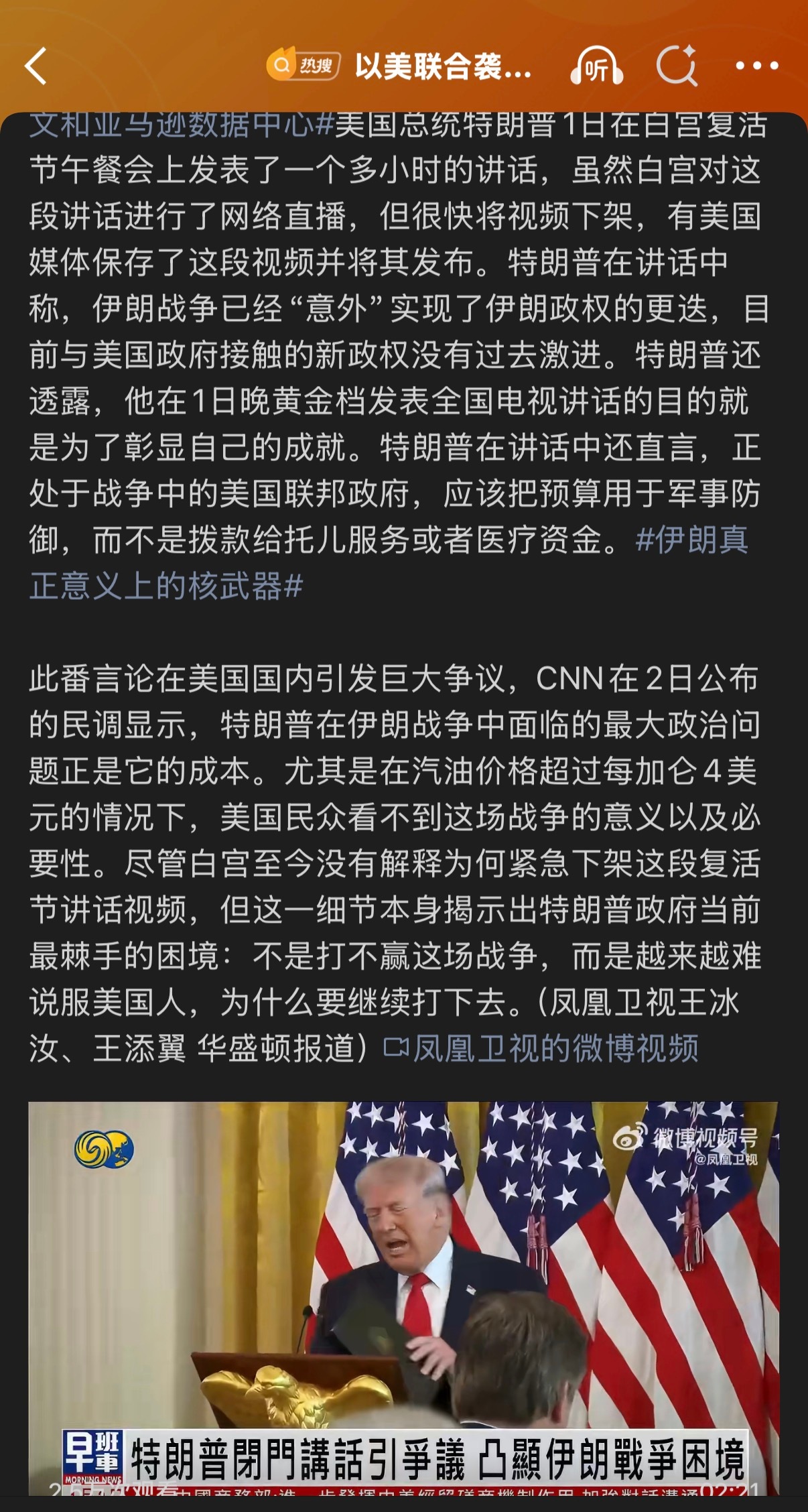 🔻真的,白宫官网把昨天特朗普的视频删了。🔻就是“我要把主要精力放在军事上,我们是一个大国。我们正在打仗。美国无法兼顾日托、医疗补助和医疗保险,各州应该自行加税并自行买单”那一段。伊朗袭击美甲骨文和亚马逊数据中心特朗普放炸桥视频施压伊朗海外新鲜事中东现场直击