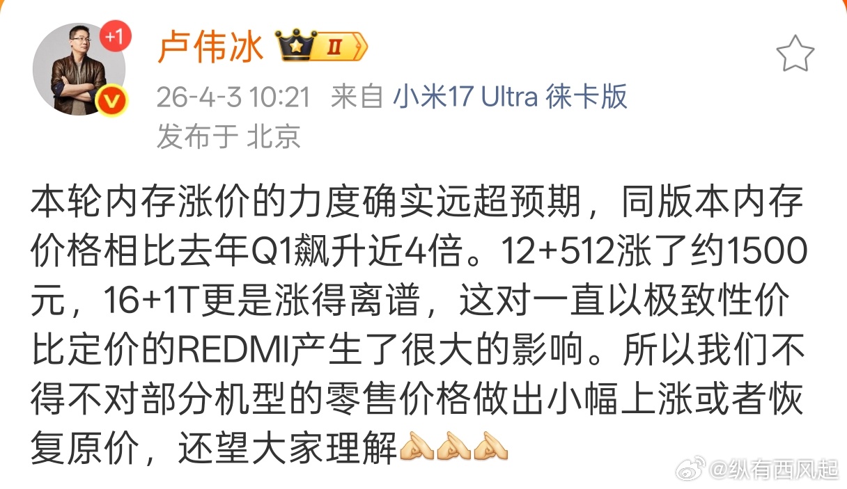 卢伟冰回应小米宣布涨价内存价格同比飙升4倍,涨价大家应该都会理解,越是涨价越是贵,大家对产品的要求可能越苛刻,希望手机厂商共渡难关,继续打造出更让人喜欢的产品,比如像我手机一加15T这样的