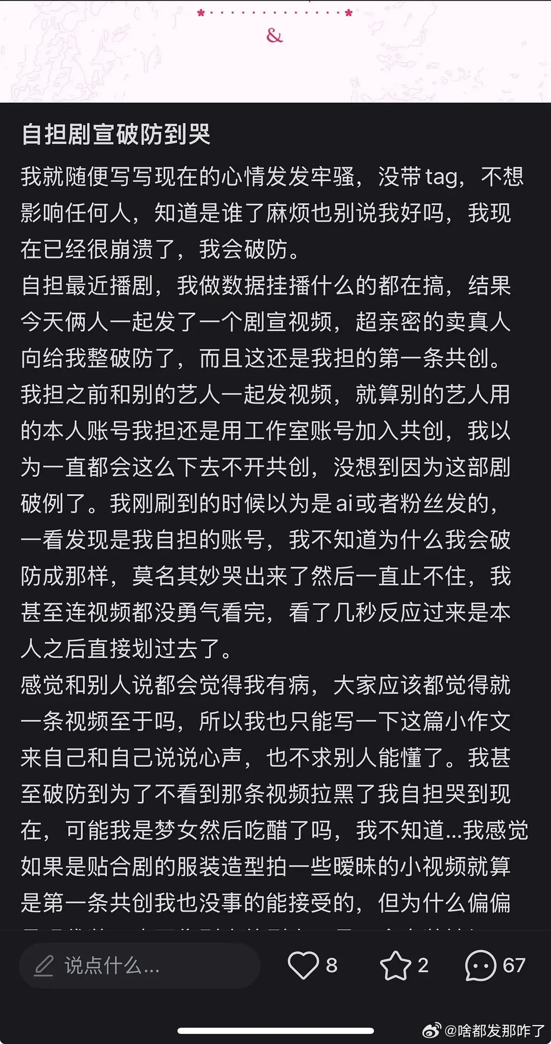 迪丽热巴粉因为88的剧宣破防到哭……这一点8粉就不如老鹿粉了,老鹿的剧宣都油腻成啥样了~