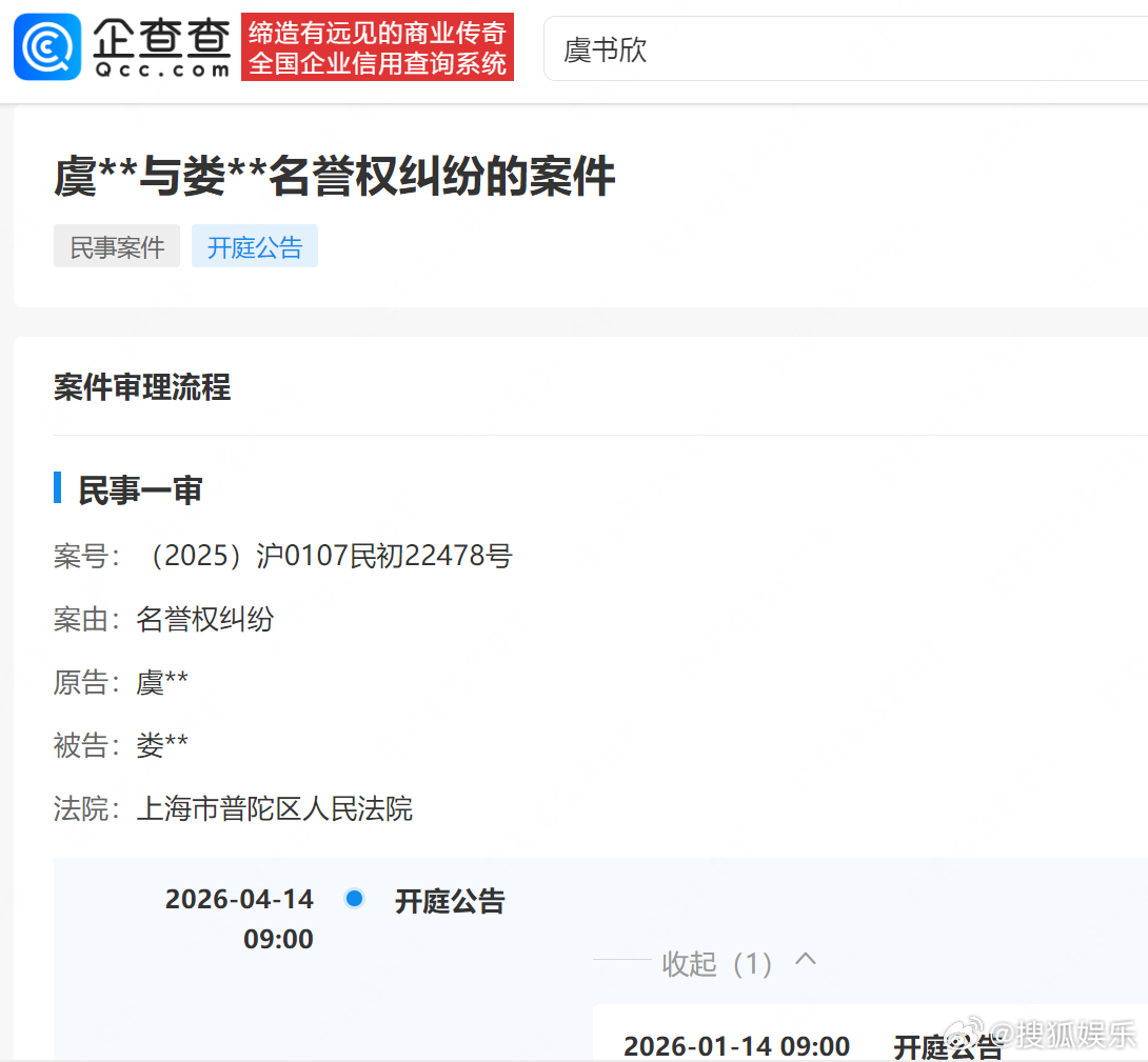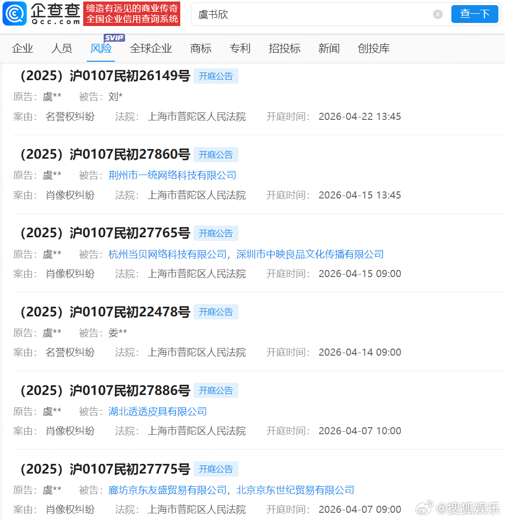 【虞书欣新增多起维权案件】虞书欣多起维权案将开庭企查查APP显示,近日,虞书欣与湖北透透皮具有限公司、娄某相关肖像权、名誉权纠纷案件分别新增开庭公告,原告均为虞书欣,上述两起案件分别将于4月7日、4月14日在上海市普陀区人民法院开庭审理。