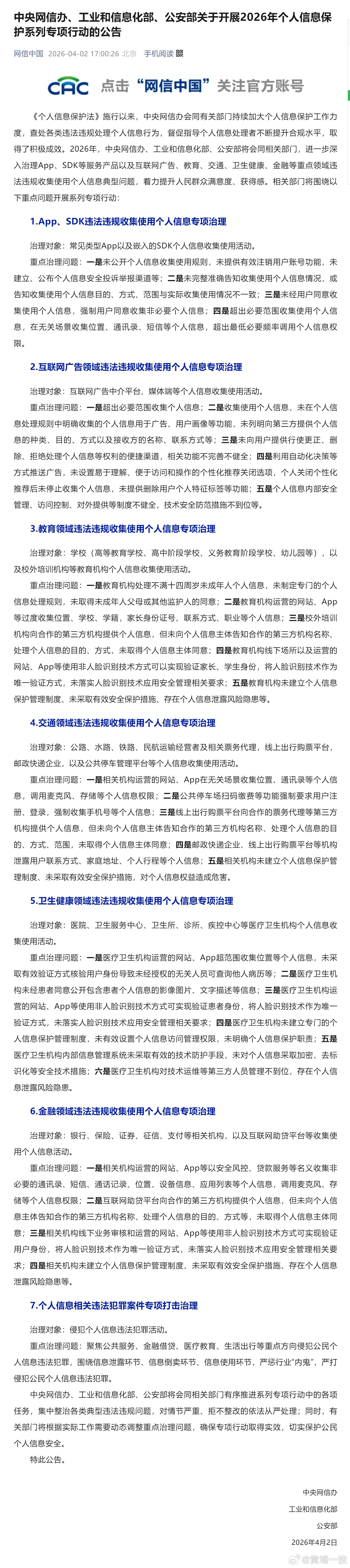 三部门开展个人信息保护专项行动【中央网信办、工业和信息化部、公安部关于开展2026年个人信息保护系列专项行动的公告】专项治理App等违规收集个人信息 《中华人民共和国个人信息保护法》施行以来,中央网信办会同有关部门持续加大个人信息保护工作力度,查处各类违法违规处理个人信息行为,督促指导个人信息处理者不断提升合规水平,取得了积极成效。2026年,中央网信办、工业和信息化部、公安部将会同相关部门,进一步深入治理App、SDK等服务产品以及互联网广告、教育、交通、卫生健康、金融等重点领域违法违规收集使用个人信息典型问题,着力提升人民群众满意度、获得感。相关部门将围绕以下重点问题开展系列专项行动↓