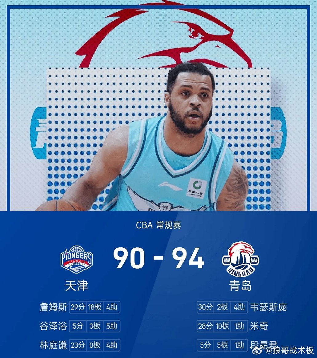 CBA战报:韦瑟斯庞30分,青岛94-90险胜天津