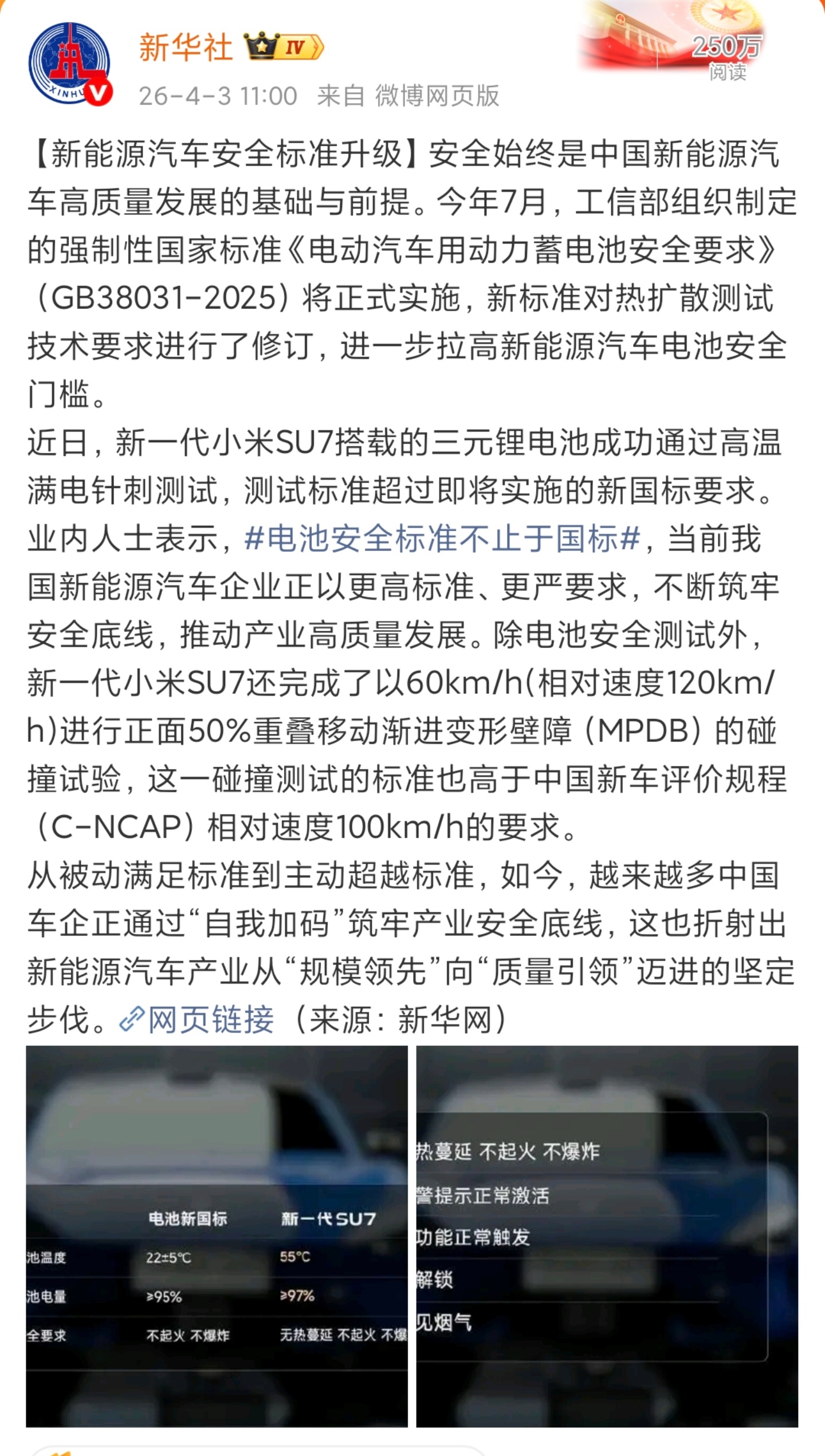 新一代小米SU7的电池是可以放心的,因为它的测试标准是“自我加压”,直接挑战比新国标更高的极限环境。电池安全标准不止于国标