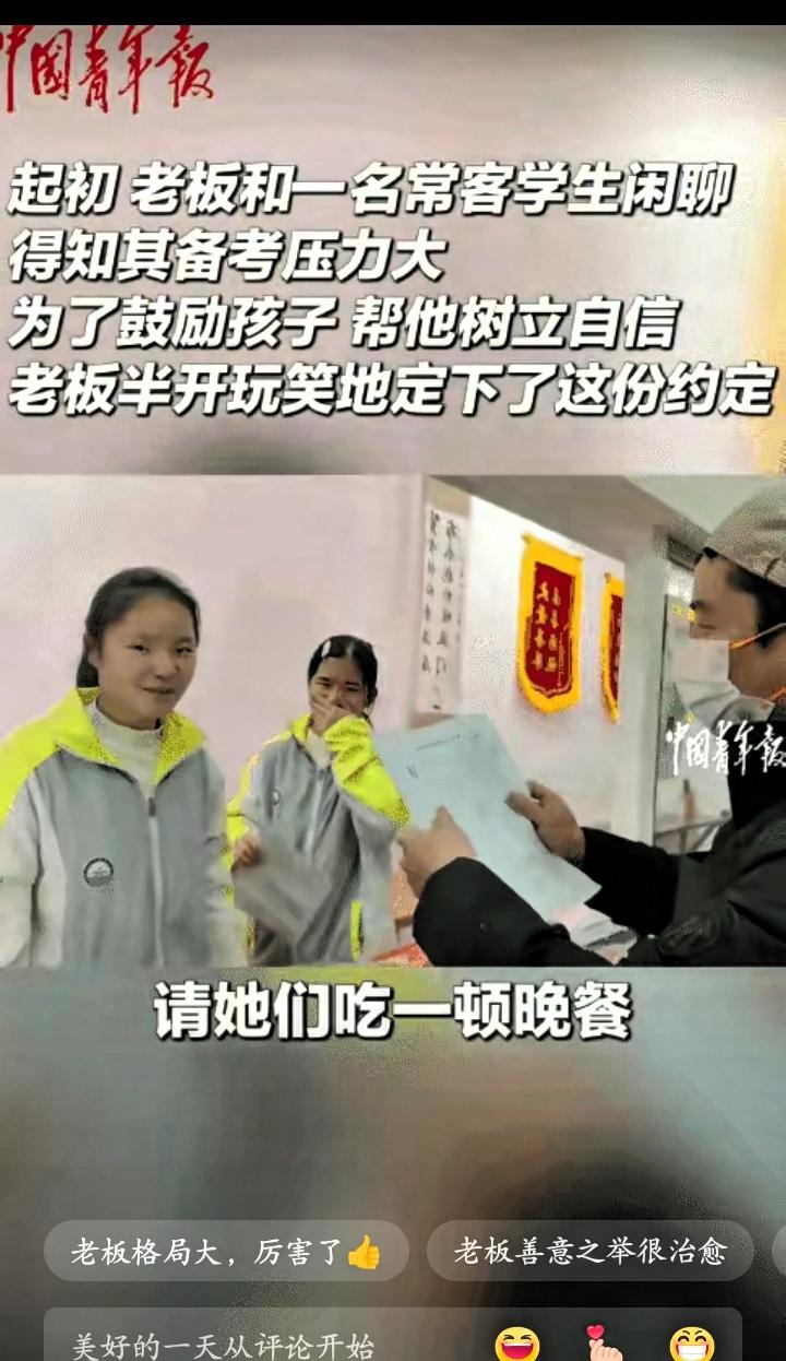 太有格局了,江西,女孩突然跑到一家包子铺对老板说:“我考了三个第一。” 没想到,老板问她:“想吃啥,我请客。”这一幕朴实又温暖,在不少人心里留下了触动。 包子铺老板平时和学生接触较多,了解到这名女孩学习很努力,只是考前压力较大,便随口和她约定,如果能考出好成绩,就请她免费吃饭。本是一句简单的鼓励,女孩却认真记在了心上。 经过一番努力,她在这次考试中取得语文、物理、政治三科全班第一的成绩。拿到成绩单后,她第一时间来到包子铺分享喜讯,神情真诚又兴奋。老板当即兑现承诺,让女孩随意挑选食物。女孩也很懂事,只点了自己日常的分量,没有多拿浪费。 这件事之后,老板把这个临时约定改成了长期的小奖励,凡是学生考出满分、班级第一或是有明显进步,都可以到店里免费就餐。上学期期末,已有多名学生前来兑现这份鼓励。 平日里,老板也一直坚持做些力所能及的善事。每周四为环卫工人免费提供包子,考试期间为考生提供休息的地方和免费餐食,也会为行动不便的老人送餐上门。这些小事虽不显眼,却实实在在温暖着身边的人。 一句平实的鼓励,能成为孩子前进的动力;一份认真的努力,也对得起他人的善意。两者相互回应,简单又真挚。 比起物质奖励,这种来自陌生人的认可与温暖,更能守护孩子的上进心。平凡生活里的小善意,往往最能打动人心。 这样朴实的双向温暖,你觉得是不是最珍贵的正能量?