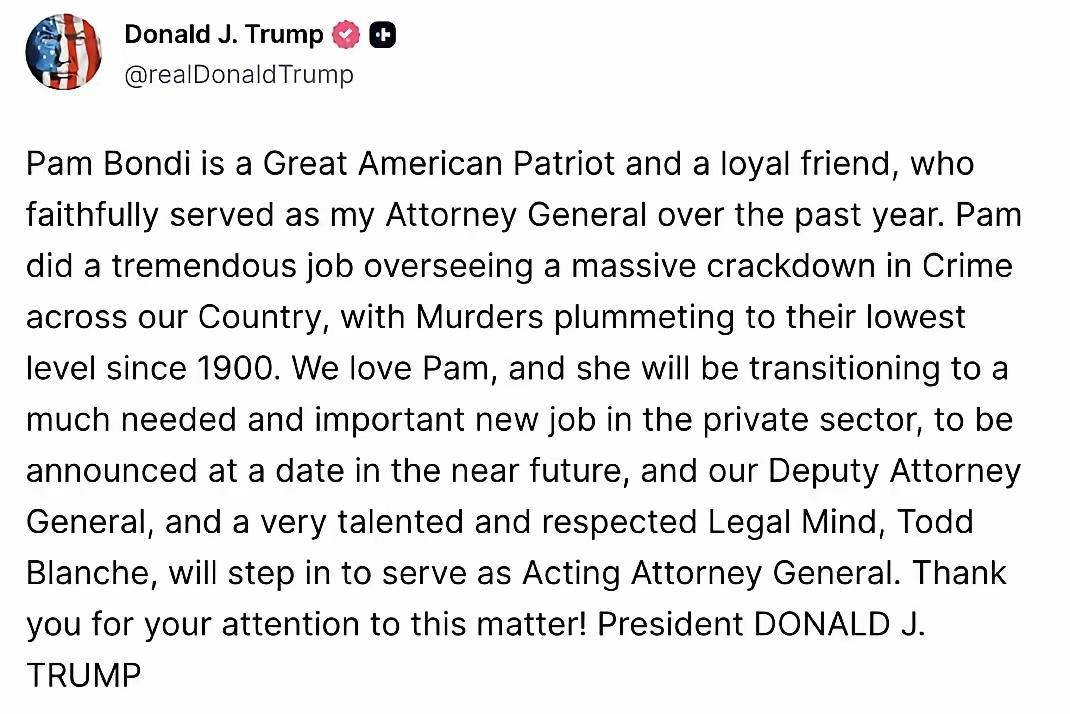 形同儿戏 2日,特朗普在社交媒体宣布,上任仅一年的司法部长帕姆·邦迪被其解雇。司法部副部长布兰奇已接任代理部长。 邦迪也成为特朗普内阁,继国土安全部长之后,第二位被解职的内阁要员。 你没看错,特朗普解雇一位部长就这么抽象。自媒体官宣,没有原因,不走流程,一切全看特朗普心情! 据悉这位特朗普的坚定盟友,突然被解雇,真实原因是其对 “爱泼斯坦案”文件的处理不当,大量政商名流的照片、视频流出,让特朗普形象受损,在美国民众中的支持率大跌,这个锅得人来背!