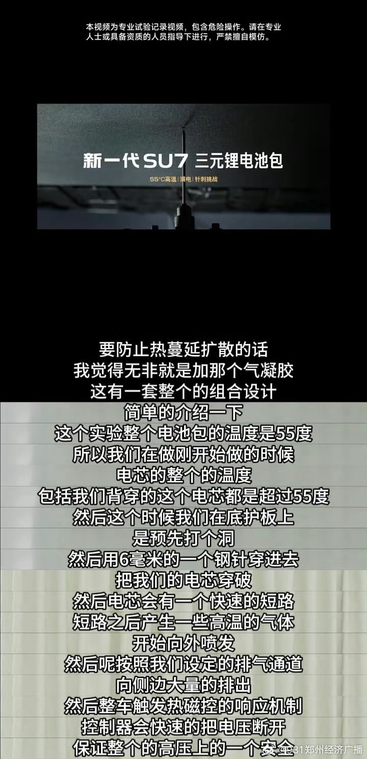 今年7月份新国标GB38031-2025正式实施,热扩散要求全面升级,而根据新华社报道,新一代SU7电池安全标准不止于国标,小米直接把测试标准拉到了国标之上,而且选的是行业公认最难的三元锂针刺。很多人不知道,三元锂电池化学活性远高于磷酸铁锂,针刺测试一直是它的“生死关”。这次新SU7 Max直接上了55℃高温+97%满电的双重极限工况,比新国标要求的22±5℃、≥95%电量严苛得多,完美复刻了夏季暴晒后满电用车的真实场景,这才是对消费者有实际参考价值的测试。最终结果是无热蔓延、不起火不爆炸,车内外和云端报警全正常,车门顺利解锁,车内连可见烟气都没有。能做到这个程度,靠的不是运气,是真金白银堆出来的硬技术:一是倒置电芯防爆阀向下设计,高温气体直接向下泄压,彻底避开乘员舱。二是电芯两侧配1.4米超长水冷板,行业顶级散热规格,从源头控温。三是航空级气凝胶隔热层,耐1000℃高温,远超电芯热失控400℃的峰值,层层阻断热传导。更难得的是,小米不是只做单项秀。除了超标针刺,还完成了相对速度120km/h的MPDB碰撞测试,比C-NCAP的100km/h标准高了20%,而且全程拆车直播,把电池内部结构、用料工艺掰开揉碎给所有人看。这种敢于在极限边界验证产品、敢于公开所有细节的态度,比任何话术都有说服力。从被动满足国标到主动定义行业高标准,这才是中国新能源汽车该有的样子。40多万车主的选择不是偶然,钱花在看不见的安全上,才是真正的物超所值。真心建议所有车企都按这个标准卷,让消费者不用再在“高能量密度”和“安全”之间做选择题。
