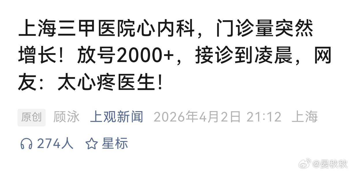 你知道吗?这两天,上海中山医院心内科普通门诊,每天放号2000+。社交媒体上的图片显示,深夜时分,诊室外的屏幕上仍显示着200+的待诊序号,有患者从中午挂号等到深夜。根据“上观新闻”,中山医院的心内科是全国顶尖,多年来实行普通门诊不限号,只要在下午16时30分前挂号即可。最近几天,普通门诊日均诊疗从1500余名升至2000余名,医生常常接诊至晚上七八点,甚至更晚。那么,近期不少名人猝死,这是否导致门诊量的增长?医生解释,每到冬春交替,本来就是心血管疾病的高发期。外加近年来大众对疾病的认知增强、疾病呈现年轻化趋势等,门诊量确实有较为明显的提升。不过这并不是今年的偶发,往年同样如此,遇到“高峰季”,院方会统筹资源,加派住院部医生来“支援”门诊,确保患者等候时间不要过长。目前,我国心血管病患病人数已高达3.3亿,且发病率和死亡率仍在上升,人口老龄化进程加剧了这一负担。同时,公众健康意识的提升,使得更多出现胸闷、心慌等症状的人,主动前往顶级医院进行筛查,以期排除风险。专家提醒,首先,心血管疾病要重视,但也没必要过度焦虑。其次,两类人群应格外警惕并主动筛查。一是有心脏病家族史的。二是有高血压、高血脂、糖尿病等“三高”人群。再次,要学会识别心脏发出的“警报”。如果出现规律性的胸痛、活动后加重的不适、疼痛放射至后背或肩臂,甚至伴有大汗、晕厥等症状,必须立即就医,时间就是生命。最后,坚持健康的生活方式是根本。均衡饮食、规律作息、管理压力、戒烟限酒,都是维护心脏健康的基石。本地新闻上海中山医院心内科日接诊2000人医生看至深夜心内科日门诊量达2000人次