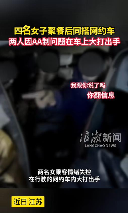 “塑料姐妹情!”近日,江苏,四名女子聚餐后一同打网约车回去,在路上有两个却因为AA制的原因吵了起来,司机出言好声相劝,冲突却还是引爆了,两个人直接在车上动起手来,甚至扬言做过一场。司机:我就想安稳开个车我容易吗! 朋友之间,吃饭聚餐是再正常不过的事了,有钱的时候轮着请,没钱的时候大家一起凑凑,也有的直接就AA制,反正就一顿饭钱,主要为的还是朋友情。 据媒体4月2日报道,这四名女子刚一起聚完餐,共同打了一辆网约车,准备回去。但是聚餐之前,却没有说清楚AA的事,结果上了车,一聊就出事了。 坐在副驾的女子对AA感到十分不满,抱怨道,“你要说AA制,你说清楚啊!”,听到这话,后排的一位女子不乐意了,嚷嚷着“你翻信息,看看我给你发信息了么!” 司机开着车也很无奈,只能出声制止,你们不要再说了,他也不敢太大声,生怕镇不住。再激化了矛盾。这时候。同行的另一位女子也开始劝要她们。没想到,都是做了无用功。 两个人情绪越来越激动,直接动起了手,前后排的距离就直接挠来挠去。中间那位女子实在是看不下去了,出手制止了这两个人。但她们并未消火,反而又吵了起来,鸡毛蒜皮的事都出来了,甚至扬言,“咱们下车打去!” 网友看后表示,就是这四个人,怕是得建五个群哦,感情也太脆弱了吧,这点考验都经不住,就这,还一起玩什么! 信息来源:《四名女子聚餐后同搭网约车,俩人因AA制问题在车上大打出手。》浪潮新闻