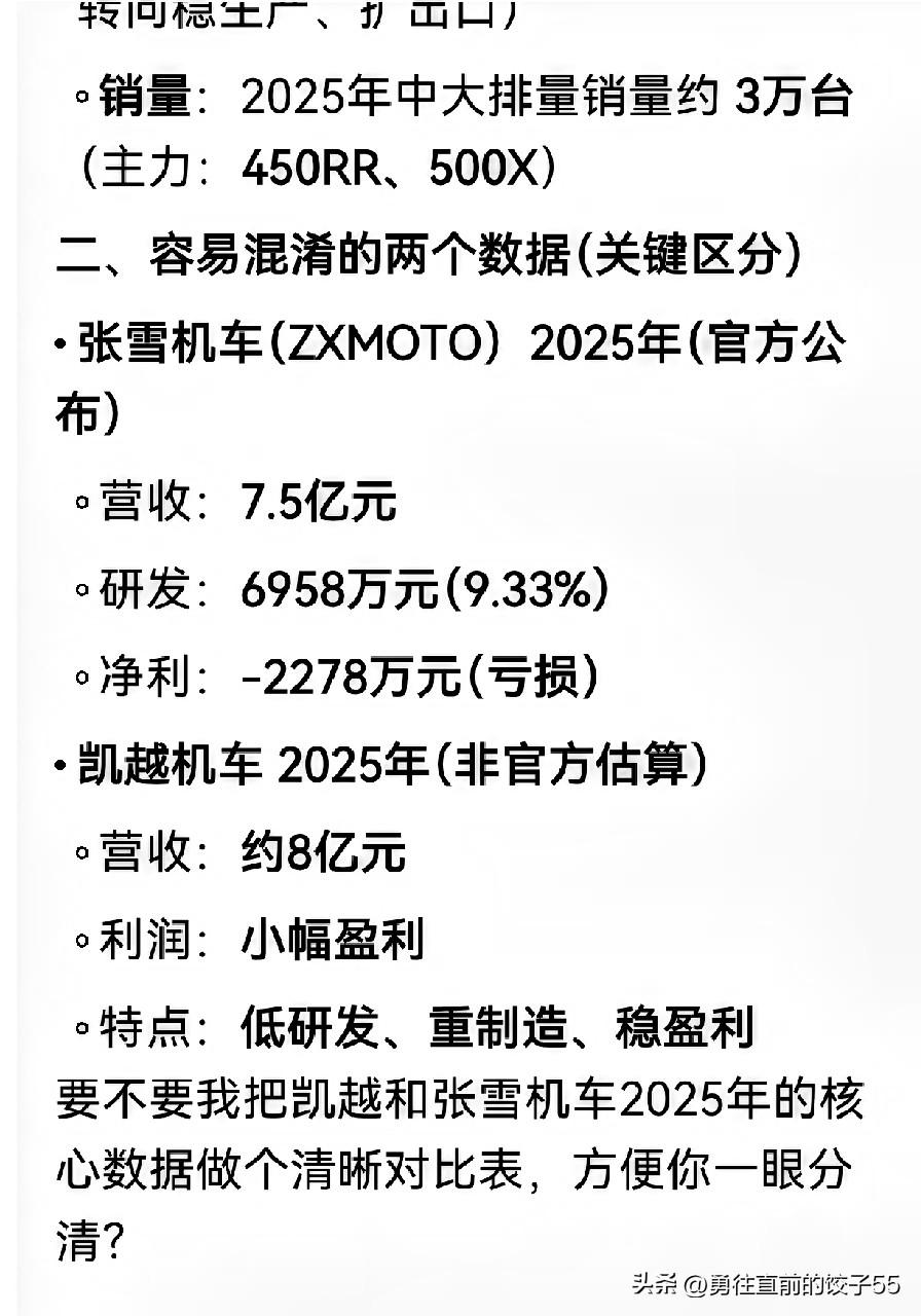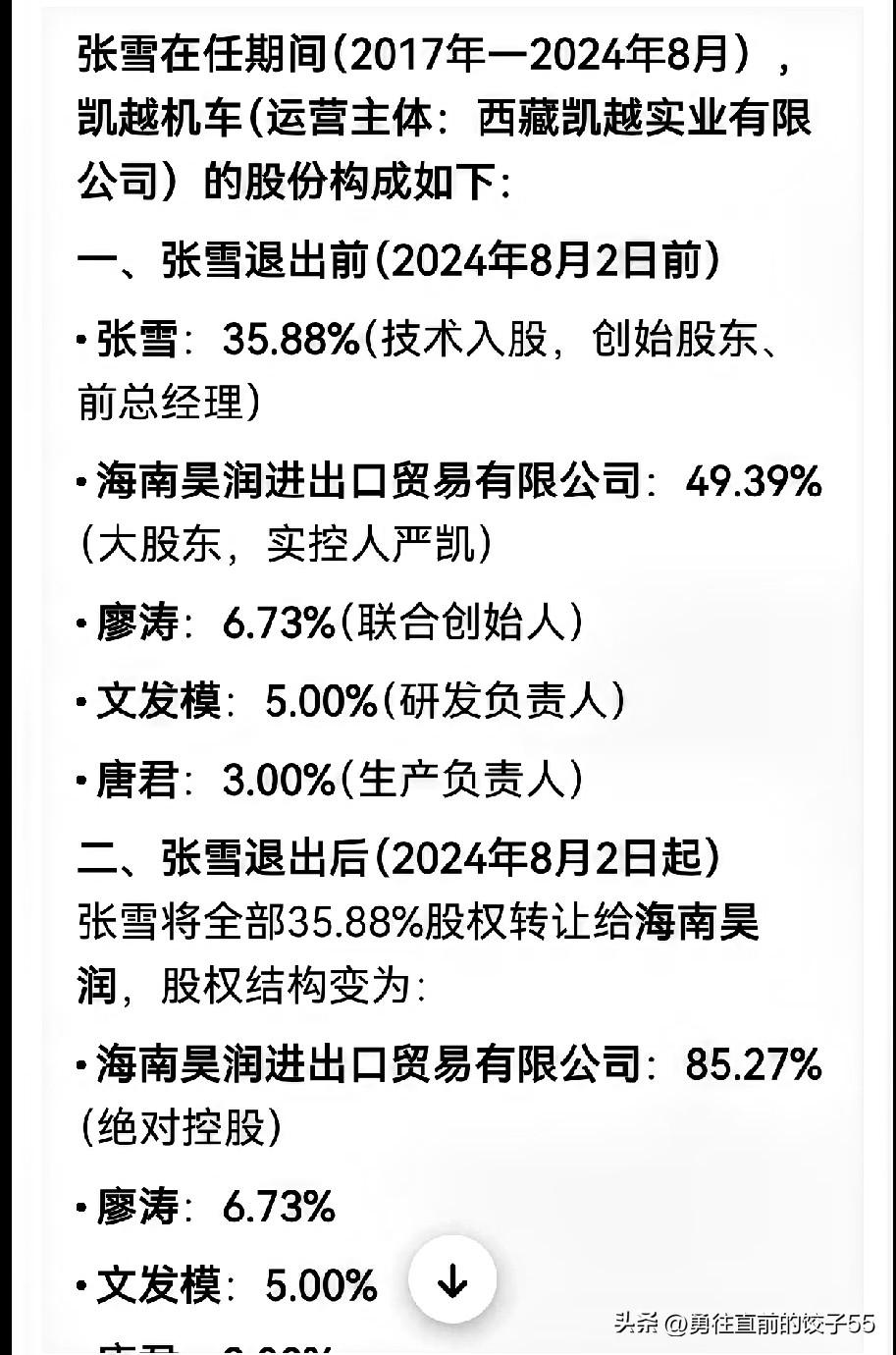 我一直觉得,凯越机车这段经历特别典型地说明了:一个企业怎么走错,往往不是市场问题,而是战略和用人的问题。 张雪一手把凯越做起来,本来已经把三缸发动机做成了企业的核心技术、也是真正能打出去的竞争力。结果在引入严凯之后,她把35%的股份转给对方,本想着强强联合、把企业做大;但现实完全走向了反面:严凯只看重短期分红和规模,把技术研发抛到一边,直接放弃了三缸机这条未来赛道。 现在的结局非常讽刺:张雪独立发展的三缸机,在全球市场一路走强,订单不断;而凯越只能靠老本磨三轮摩托,销量弱、利润薄,一步步被对手甩开。 所以我一直相信: 企业真正的护城河从来不是规模,而是人才与技术。 赶走技术核心、放弃核心竞争力,等于是把企业的未来交出去。对手在成长,你却在倒退,这样下去,想翻盘都难。