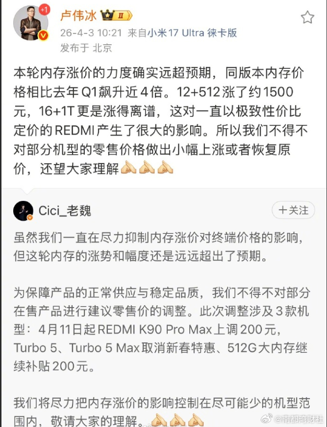 #小米总裁回应小米手机涨价#【卢伟冰回应小米手机涨价:内存价格飙升近4倍,远超预期】#小米总裁称内存价格飙升近4倍# 小米终于“扛不住”内存压力涨价了。 #小米调价# 近期,小米发布公告称,受全球存储芯片等关键零部件价格持续大幅飙升影响,经过审慎评估,小米将自2026年4月11日00:00起,调整部分在售产品的建议零售价。此次调整涉及3款机型:REDMI K90 Pro Max上调200元,Turbo 5、Turbo 5 Max取消新春特惠、512G大内存继续补贴200元。
