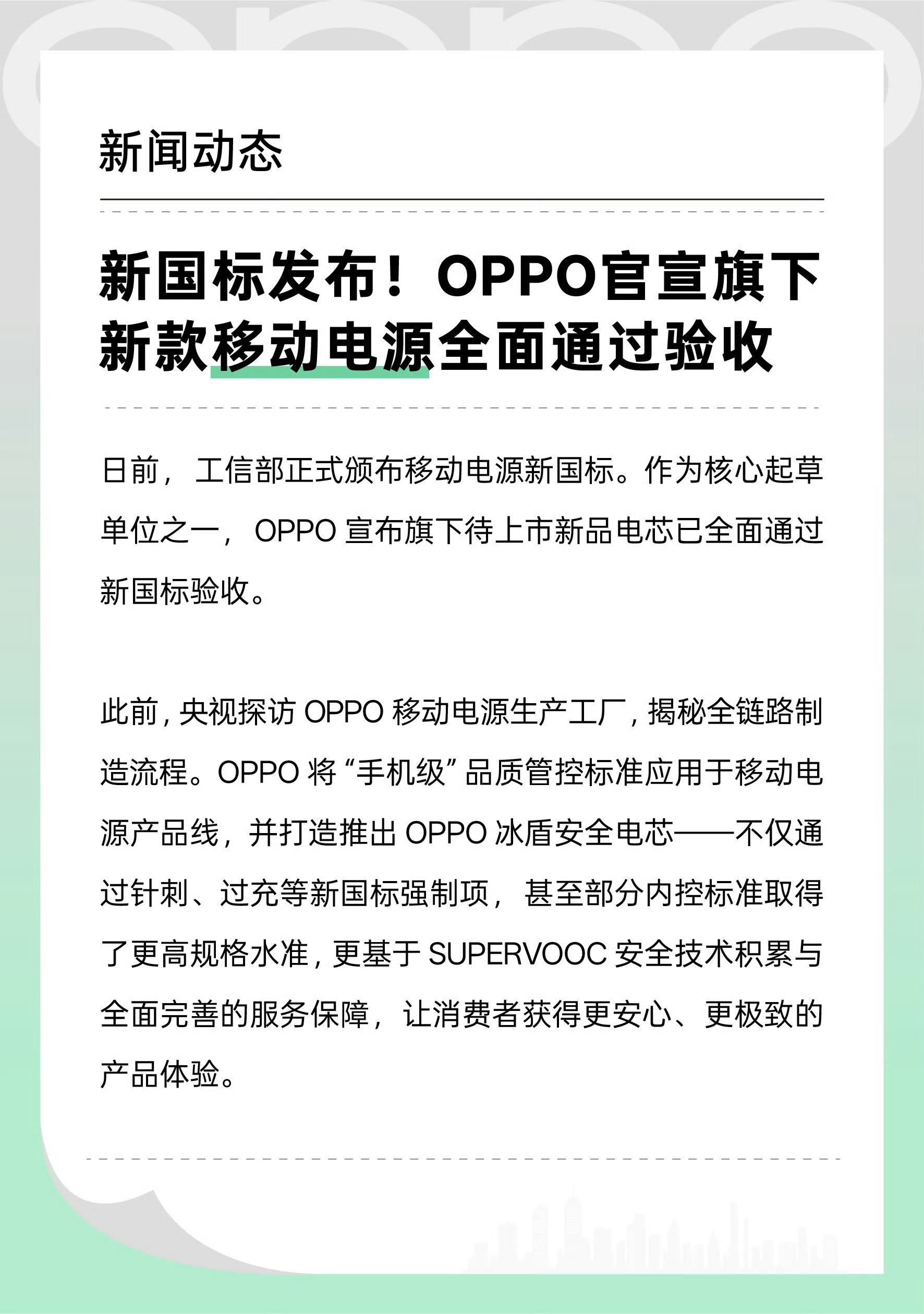 工信部正式颁布移动电源新国标。作为核心起草单位之一,OPPO宣布旗下待上市新品电芯已全面通过新国标验收。此前,央视探访OPPO移动电源生产工厂,揭秘全链路制造流程。OPPO将“手机级”品质管控标准应用于移动电源产品线,并打造推出OPPO冰盾安全电芯——不仅通过针刺、过充等新国标强制项,甚至部分内控标准取得了更高规格水准,更基于SUPERVOOC安全技术积累与全面完善的服务保障,让消费者获得更安心、更极致的产品体验。