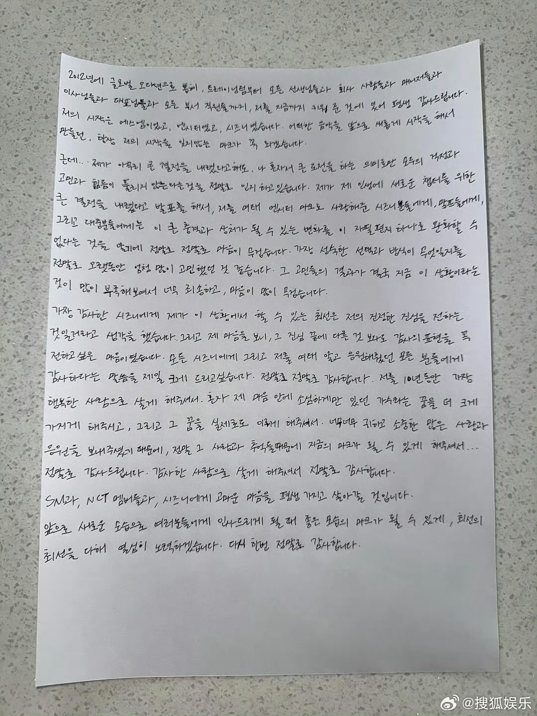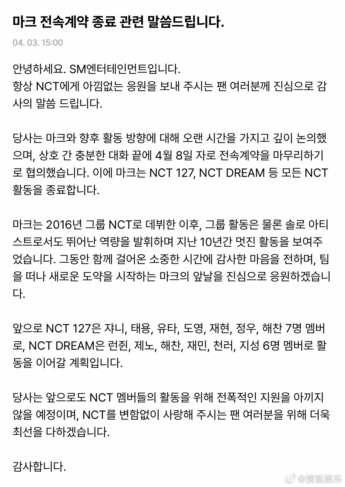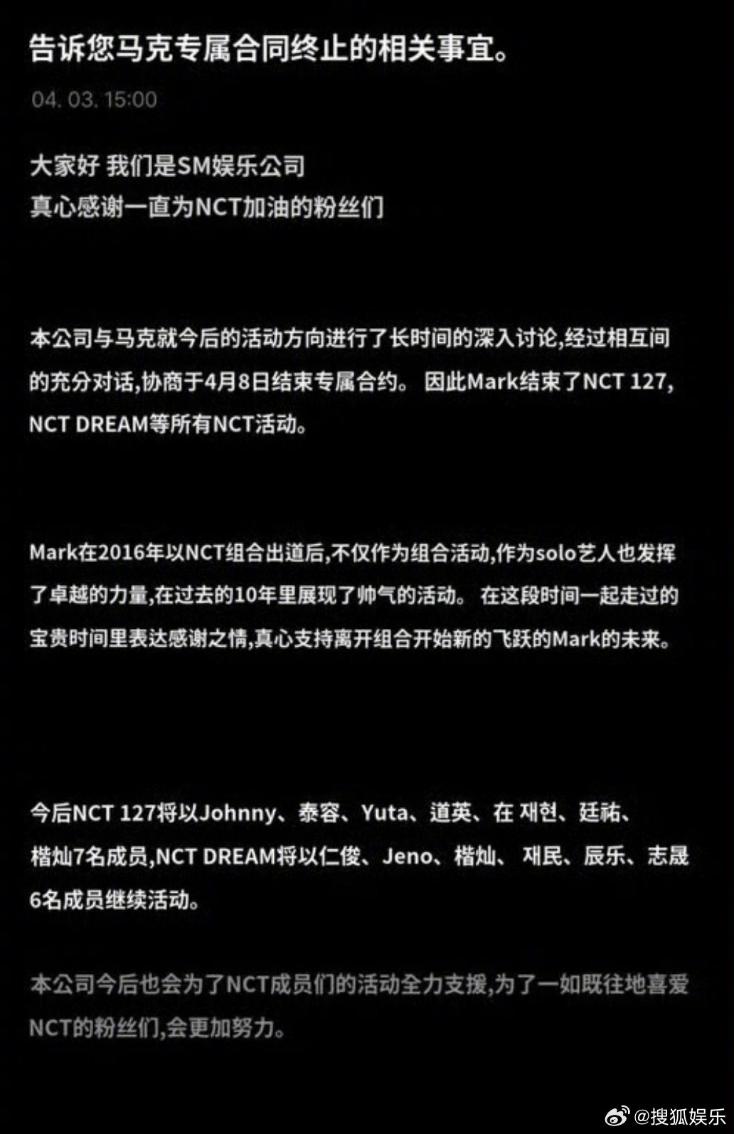 李马克解约退团 韩国SM公司发布声明,宣布李马克退出NCT。李马克发布退团手写信,“未来无论制作什么样的新音乐,我都会是那个永远不会忘记自己起点的李马克。”
