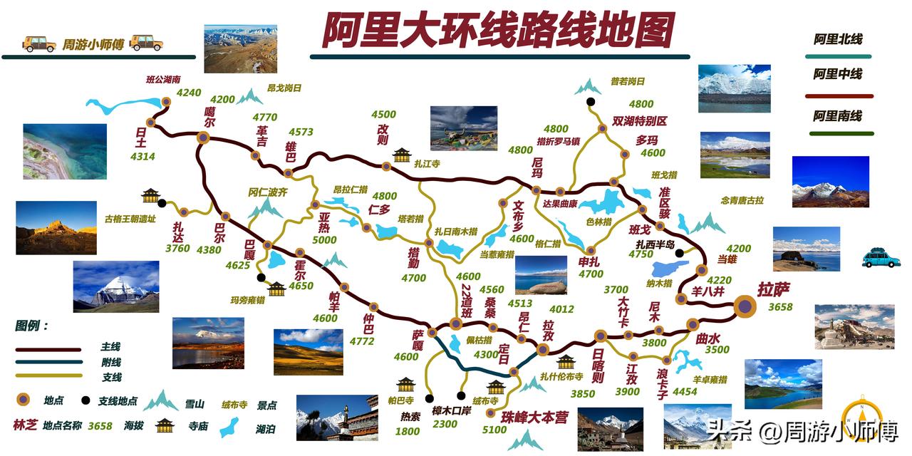 6条进藏自驾路线及攻略(每天约300-500公里/天,行程7-15天不等): 川藏南线(G318):成都→康定→理塘→林芝→拉萨。经典景观大道,适合首次进藏,7-10天。 川藏北线(G317):成都→色达→昌都→那曲→拉萨。人文丰富、路况挑战大,9-12天。 青藏线(G109):西宁→青海湖→格尔木→那曲→拉萨。海拔爬升缓,货车多,5-7天。 滇藏线(G214转G318):昆明→大理→德钦→林芝→拉萨。融合横断山脉风光,7-9天。 新藏线(G219):叶城→阿里→日喀则→拉萨。高海拔荒野穿越,适合越野老手,10-14天。 阿里大环线:拉萨→珠峰→札达→狮泉河→措勤→拉萨。深入西藏西部,需越野车,12-15天。 通用攻略: 车辆:四驱SUV,备胎/防滑链/充气泵。 时间:5-10月最佳,避开7-8月部分塌方风险。 证件:身份证、驾驶证、边防证(阿里、珠峰等地需提前办理)。 高原:提前服用红景天,备氧气瓶,避免剧烈运动。 补给:每日加满油,藏区城镇间距远,备足干粮、热水。 安全:下载离线地图,勿赶夜路,谨慎通过涉水路段。