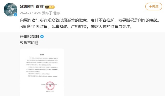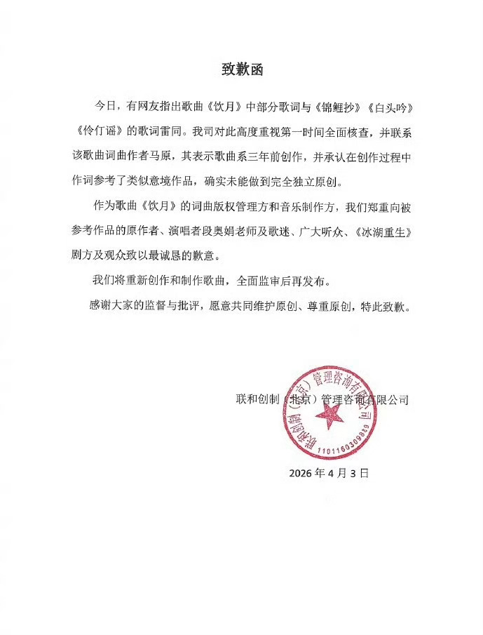 有网友发现《冰湖重生》疑似抄袭三首经典古风歌曲,引发热议。刚刚《冰湖重生》道歉了