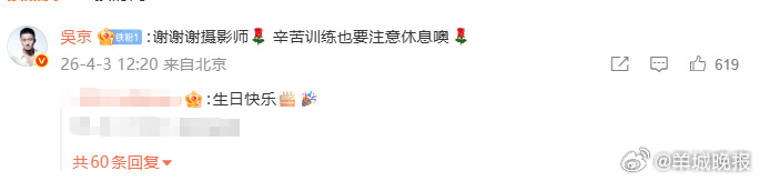 【#吴京让谢楠注意休息# 】4月3日,发文给庆生:“发一张我拍的吴师傅~~生日快乐呀”#谢楠晒图祝吴京生日快乐#随后在评论区甜蜜回应: 谢谢谢摄影师,辛苦训练也要注意休息噢!(四川观察)更多消息:#李马克解约退团##席瑞喊话李荣浩##时代峰峻高会声明##袁咏仪说浪姐请不到我李心洁请到##范丞丞赵今麦 绝命循环##李马克退团手写信#(编辑:惠天骄;审签:艾渝)