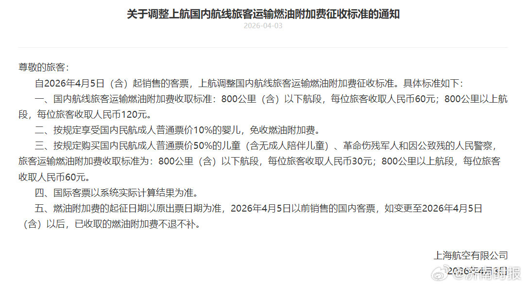 【#东航上航调整国内航线燃油附加费# 】4月3日,东方航空、上海航空相继发布通知,自2026年4月5日(含)起销售的客票,调整国内航线旅客运输燃油附加费征收标准。具体如下: