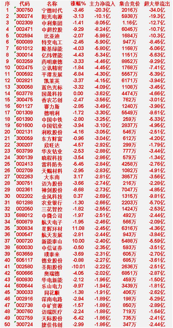 4月3日尾盘30分钟,主力资金大幅卖出的50名单! 宁德时代:主力净流出 20.3 亿元,超大单净流出 34.0 亿元 阳光电源:主力净流出 10.1 亿元,超大单净流出 19.3 亿元 中利集团:主力净流出 9.05 亿元,超大单净流出 12.7 亿元 中超控股:主力净流出 8.24 亿元,超大单净流出 10.7 亿元 比亚迪:主力净流出 5.98 亿元,超大单净流出 10.3 亿元 特变电工:主力净流出 5.90 亿元,超大单净流出 8.45 亿元