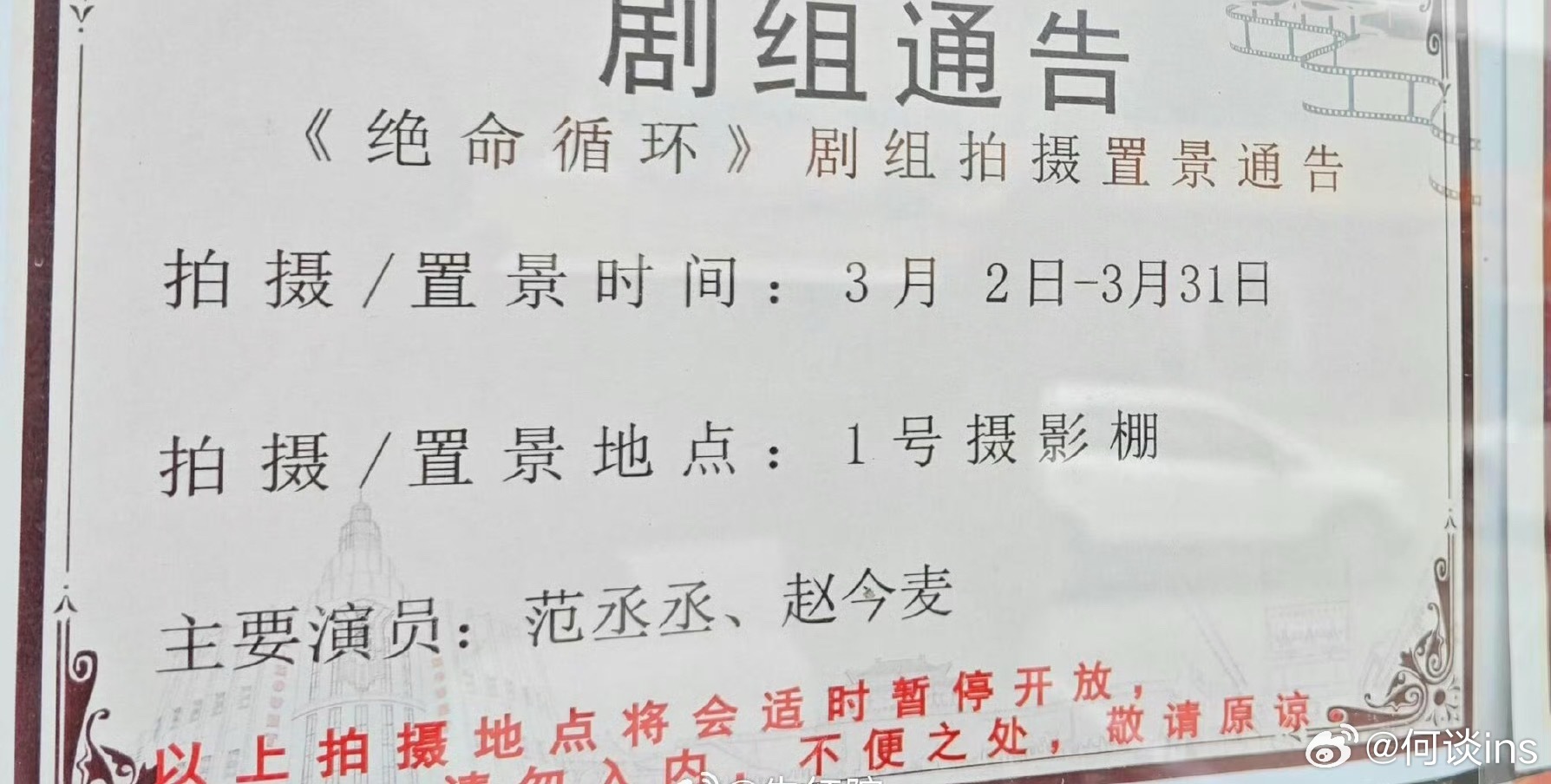 电影《绝命循环》(《死期将至》)佛山开机主演:范丞丞、赵今麦导演:张壹男(张艺谋儿子)