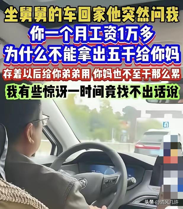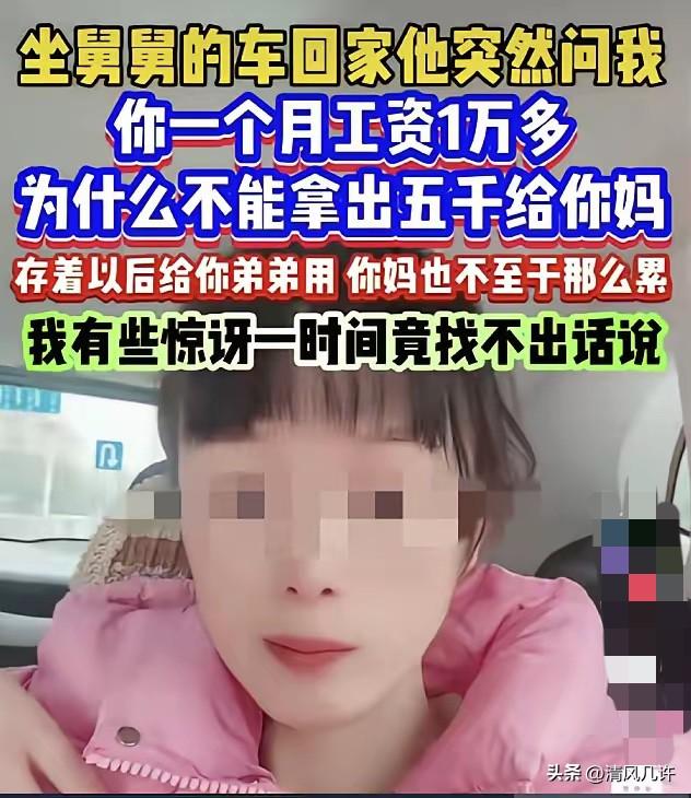 “又是一个樊胜美!”福建,一女子坐舅舅车回家,舅舅说她,你一个月工资一万多,为什么不拿出5000元给你妈?存着以后给你弟弟用,这样你妈就不用那么累了,女子惊呆,一时间不知道怎么回答,她问网友,如果弟弟3岁我可以给,如今他25岁,你们看我应该给吗? 女子在城里打拼多年,从刚毕业的几千块工资,熬到现在月入一万多,每一分钱都是起早贪黑赚来的。 她不是没帮过家里,弟弟从高中到大学的学费、生活费,全是她承担;弟弟找工作,她托遍了身边的关系,帮着找了稳定的岗位;弟弟买房首付,她把自己攒了好几年、准备给自己买房的钱,一分不少拿了出来。她本想着,弟弟成年、工作、买房后,能自己扛起生活,没想到,家里人还是把她当成了弟弟的长期提款机,丝毫没有顾及她的处境。 舅舅的话,根本不是随口的指责,而是整个家庭重男轻女思想的直白体现。在舅舅和父母眼里,女儿的收入就是家庭的共同财产,就是给儿子攒的家底,姐姐帮扶弟弟是天经地义的责任,完全不管姐姐在城里的生活压力。 她每个月一万多的工资,扣完房租、社保、通勤和日常开销,再加上给父母的固定养老钱,手里能攒下的钱本就有限,要是再拿出五千给弟弟,她自己的生活将彻底难以为继,更别说攒钱买房、规划自己的未来。 女子当时的震惊,源于这句话彻底戳破了家里人一直以来的算计。 她之前就察觉到,父母总在她面前哭穷,说弟弟要结婚、要彩礼,压力大,本质就是想让她多掏钱,只是这次舅舅把话挑明,直接要求她每月拿出一半工资给弟弟攒钱,没有任何商量的余地。她不是不孝,给父母养老、尽赡养义务是她的责任,但让她用自己的工资供养已经25岁、完全具备劳动能力的弟弟,从来不是她的义务。 她碍于亲戚情面,一时间没能当场反驳,但心里已经无比清醒。 她清楚,一旦答应这个要求,等待她的将是无穷无尽的索取:弟弟结婚要她出钱,弟弟买车要她出钱,弟弟生孩子要她出钱,她这辈子都会活在给弟弟打工的阴影里,彻底变成现实版的樊胜美,永远没有属于自己的人生。 这件事发到网上后,瞬间引发全网共鸣,绝大多数网友都坚定站在女子这边。网友们明确表示,成年兄弟姐妹之间没有法定扶养义务,弟弟25岁已是完全民事行为能力人,有手有脚能自己赚钱,根本没有资格要求姐姐供养。 舅舅的行为,本质是站着说话不腰疼的道德绑架,是重男轻女糟粕思想的体现,把女儿当成了儿子的附属品,完全无视姐姐的个人权益。还有不少网友分享了类似的经历,提醒女子一定要守住底线,绝不能开这个头,否则只会被家庭无底线榨干,最后落得人财两空的下场。 少数持不同意见的网友,认为亲姐弟之间帮衬是情分,但这种声音很快被淹没。大家都明白,情分是自愿的帮扶,不是强制的索取,更不是用亲情绑架姐姐牺牲自己的人生。真正的亲情,是互相体谅,而不是一方无底线付出,另一方理所当然索取。 女子在网友的鼓励下,终于鼓起勇气,明确拒绝了家里人的要求。她跟父母摊牌,说自己会按时足额给父母养老钱,尽到女儿的全部赡养义务,但绝不会再给弟弟掏一分钱。 弟弟已经成年,该自己去奋斗,自己的人生要自己负责,不能一辈子靠姐姐兜底。家里人一开始闹得很凶,指责她不孝、冷血,但女子态度坚决,再也没有松口,慢慢的,家里人也接受了现实,不再向她索要钱财。 女子守住了自己的底线,没有沦为樊胜美,她用行动打破了重男轻女家庭对女儿的道德绑架,也给所有身处类似困境的女孩树立了榜样。 她明白,亲情从来不是无底线的牺牲,不是用女儿的人生去成全儿子的人生,每个人都有权利为自己而活,都有资格掌控自己的人生,不能为了别人的未来,耗尽自己的一生。 这件事也给所有重男轻女的家庭敲响了警钟:女儿从来不是家里的提款机,不是儿子的垫脚石,她们有自己的梦想、生活和人生价值,绝不能用所谓的亲情,绑架她们的人生。真正的家庭温暖,是互相扶持、彼此成就,而不是一方牺牲、一方索取。 各位读者你们怎么看?欢迎在评论区讨论。