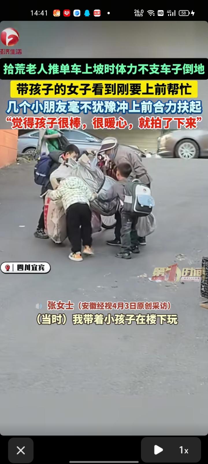 3月31日,四川宜宾。拍摄者张女士称,老人推着自行车,上面装了很多东西,因为坡陡东西很重,自行车就倒了。当时下午六点多,孩子们放学的时候,开始那几个小朋友在那边玩闹。两个小学生和一个幼儿园小朋友毫不犹豫上前帮忙看到老人车子倒了之后,觉得孩子们很棒也很暖心,就拍下来了