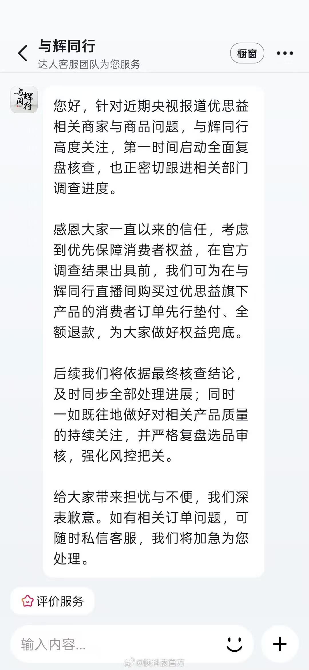 针对近期带货“优思益”产品引发的争议,与辉同行方面迅速做出回应。为优先保障消费者权益,官方决定在调查结果出炉前,为在该直播间购买过该品牌产品的消费者提供先行垫付的全额退款服务。(快科技)