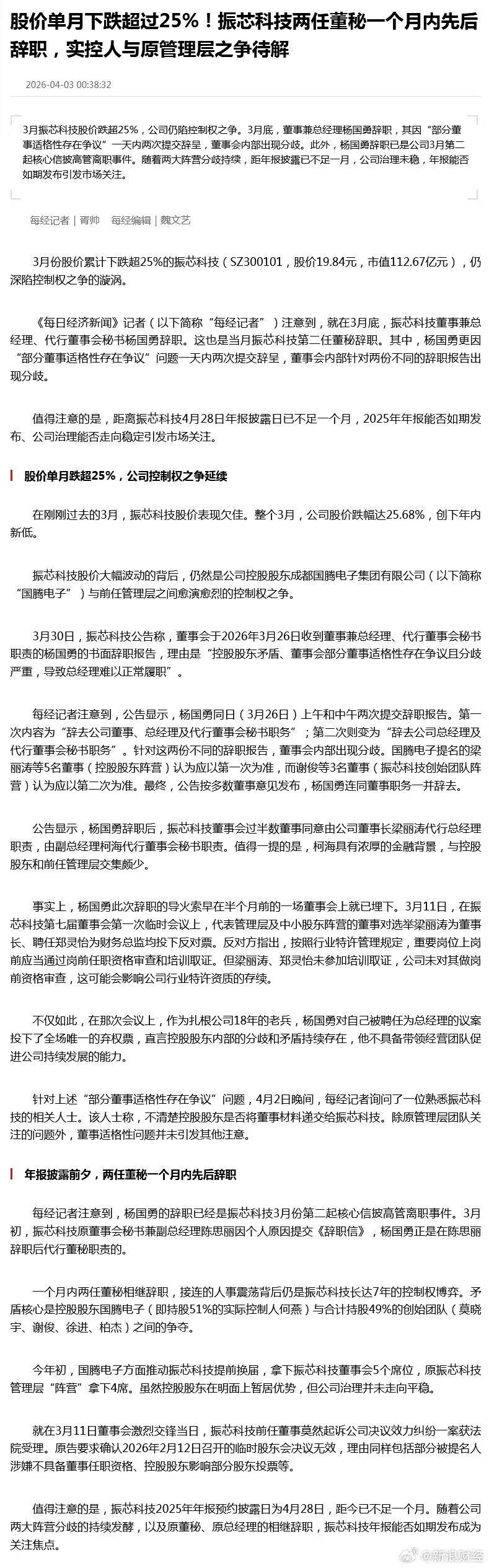 股价在3月累计下挫超25%的振芯科技,正陷入激烈的控制权争夺战。据《每日经济新闻》报道,3月底公司董事兼总经理杨国勇辞去代行董秘职务,这是当月第二位离职的董秘。由于涉及“董事适格性争议”,杨国勇曾一天内两度提交辞呈,导致董事会内部产生分歧。随着4月28年报披露日临近,公司治理不稳给财报能否如期发布蒙上阴影。(每经)