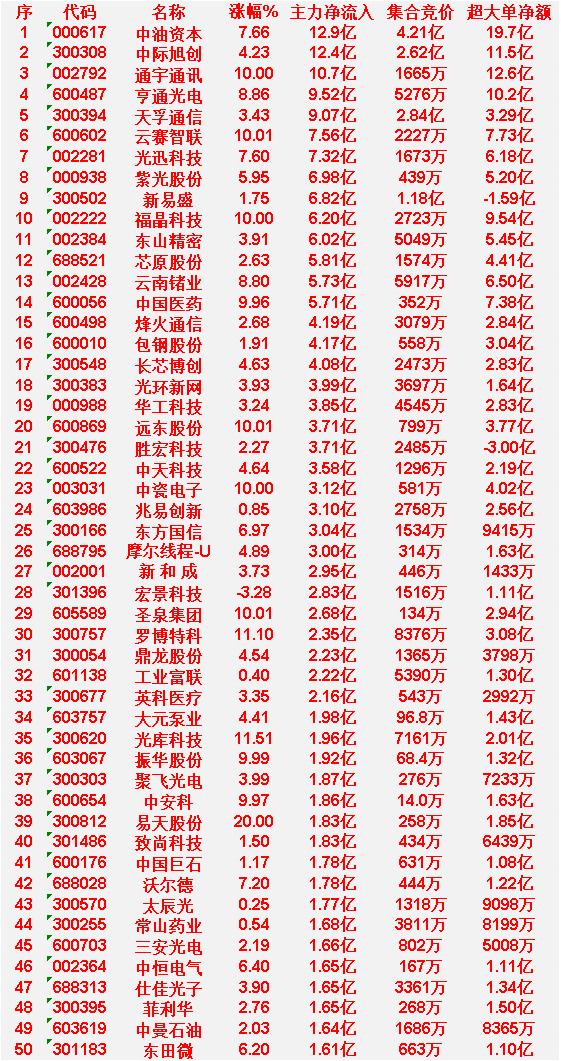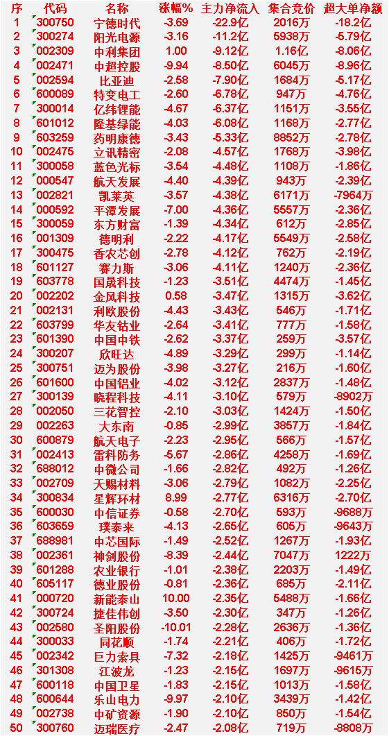 4月3日收盘,主力资金,已经大幅卖出的50名单: 中油资本:主力净流入 12.9 亿元,超大单净流入 19.7 亿元 中际旭创:主力净流入 12.4 亿元,超大单净流入 11.5 亿元 通宇通讯:主力净流入 10.7 亿元,超大单净流入 12.6 亿元 亨通光电:主力净流入 9.52 亿元,超大单净流入 10.2 亿元 天孚通信:主力净流入 9.07 亿元,超大单净流入 3.29 亿元 云赛智联:主力净流入 7.56 亿元,超大单净流入 7.73 亿元 4月3日收盘,主力资金“大幅买入”的50名单: 宁德时代:主力净流出 22.9 亿元,超大单净流出 18.2 亿元 阳光电源:主力净流出 11.2 亿元,超大单净流出 5.79 亿元 中利集团:主力净流出 9.12 亿元,超大单净流出 8.06 亿元 中超控股:主力净流出 8.50 亿元,超大单净流出 8.96 亿元 比亚迪:主力净流出 7.90 亿元,超大单净流出 5.17 亿元 特变电工:主力净流出 6.78 亿元,超大单净流出 4.76 亿元