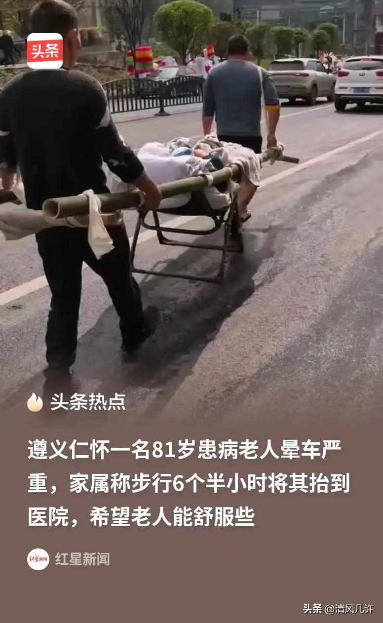 遵义仁怀,儿媳妇请了六个人,外加四五个亲戚,一并将自己81岁的婆婆抬到医院,路程总共22.7公里,步行了六个半小时,并且后面还跟着两辆车,抬累了的人就上车休息,换另外的人继续抬。这是因为婆婆坐车会晕,就连三轮车都会晕,所以为了让婆婆舒服一点,儿媳妇就和老公商量,用这样的办法送婆婆去就医。 这件事的起因,藏着一段让一家人都感慨的过往。婆婆今年81岁,家住仁怀市茅台镇双龙村,3月25日突发昏迷,被紧急送往遵义医学院救治。医生检查后确诊是脑干血管瘤破裂出血,年事已高的身体经不起大手术,只能安排保守治疗。 在医院观察两天两夜,婆婆一直处于昏迷状态,家属只能守在床边,满心焦急。谁也没想到,把婆婆接回家休养后,她竟慢慢有了意识,意识越来越清醒,身体状况也有了好转,一家人既惊喜又坚定,必须再送婆婆就医,哪怕只有一线希望,也不能留下遗憾。 送医的最大阻碍,就是婆婆严重的晕车症。平日里,婆婆连坐人力三轮车都会呕吐不止,普通车辆的颠簸和晃动,会让她瞬间脸色惨白、呕吐不止,连晕车药都起不到任何作用。儿媳刘秀反复尝试,试过开慢车、换不同车型,甚至准备了多种晕车药,结果都是一样,婆婆在车上痛苦不堪,根本没法安稳前往医院。 和丈夫商量后,刘秀做出了这个让所有人都动容的决定。 她立刻联系了村里六个身强力壮的汉子,又召集了四五个亲戚,大家分工明确,负责抬担架、看护老人、后勤补给。出发前,一家人连夜准备,把躺椅固定在两根粗壮的竹竿上,四周裹上厚厚的棉被,让婆婆躺在上面能尽量平稳;准备了充足的饮用水、干粮和急救用品,两辆车跟在队伍后面,一辆载着备用物资,一辆供轮换的人休息。 3月30日上午9时,队伍正式从双龙村出发。22.7公里的路程,大多是蜿蜒的山路,路面崎岖不平,抬担架的人每走几百米就要轮换,抬累了的人立刻上车休息,换另外的人继续接力。外孙刘小兵全程跟队,脖子上挂着布带分担重量,时不时给婆婆喂水、擦汗,一路上反复叮嘱抬担架的人放慢脚步,保证老人的平稳。 队伍在路上走了六个半小时,计步软件上显示31799步,每一步都走得格外沉重。抬担架的汉子们汗流浃背,衣服湿透了一遍又一遍,却没有一个人喊累、喊退。 跟队的车辆全程打着双闪,缓慢行驶在队伍后方,遇到过往车辆,司机们都会主动避让,纷纷投来敬佩的目光,有人特意停车询问,想要加入队伍帮忙,被刘秀婉拒,她只希望队伍能平稳,让婆婆安安稳稳抵达医院。 沿途遇到的路人,都被这一幕打动。开车路过的高先生正好与队伍相向而行,看到一行人抬着老人缓慢前行,后面跟着两辆车,得知是送81岁老人就医,当场感慨,拿出手机拍下这感人的画面,事后还将视频发布到社交平台,让更多人看到这份孝心。 下午4点左右,队伍终于抵达仁怀市人民医院。婆婆被顺利抬进病房,医务人员看到这一幕也深受触动,立刻安排了后续的检查和治疗。儿媳刘秀顾不上自己满身疲惫,第一时间找到医生了解婆婆的病情,确认老人身体稳定后,才松了一口气,坐在病床边,紧紧握着婆婆的手,反复叮嘱要安心养病。 仁怀市人民医院的工作人员证实,这位81岁的老人已于3月30日住院接受治疗,目前病情稳定。老人的儿子,也就是儿媳的丈夫,全程跟队,看着妻子和亲戚们累得站不稳,眼眶泛红,他说,这辈子最幸运的事,就是娶了这么懂事的媳妇。 婆婆躺在病床上,虽然虚弱,却一直拉着儿媳的手,反复说着谢谢,浑浊的眼睛里满是泪水,这一路的颠簸,她没有喊过一次不舒服,只是心疼抬她的人,这份祖孙情、婆媳情,藏着最朴素的爱。 这件事被曝光后,迅速在网上引发热议。网友们纷纷为这家人的孝心点赞,有人说,这才是真正的孝顺,不是嘴上的空话,是用实际行动,为老人拼尽全力争取生机;有人感慨,在很多人只顾自己、对老人疏于照顾的当下,这家人的做法太让人动容;还有很多网友分享了自己的经历,说孝顺从来不是金钱能衡量的,是愿意为老人放下一切,哪怕付出再多辛苦,也不让老人受一点委屈。 在重男轻女思想仍有残留的农村,很多儿媳和婆婆之间难免有隔阂,但刘秀用行动打破了这种隔阂。她没有把婆婆当成外人,而是把婆婆的健康放在第一位,为了让婆婆舒服,不惜用最笨、最辛苦的方式送医,这份心意,比任何物质都更能打动人心。 后来,亲戚们说起这件事,都表示不觉得累。大家都说,老人这辈子不容易,拉扯大几个孩子,到老了生病,晚辈就该尽心尽力伺候。抬着老人去医院,是尽孝,是本分,大家心里都心甘情愿。 如今,婆婆在医院接受治疗,病情逐渐稳定。儿媳刘秀每天都会去医院陪护,给婆婆擦身、喂饭,陪婆婆说话,小两口的悉心照顾,让婆婆的精神状态越来越好。 各位读者你们怎么看?欢迎在评论区讨论。